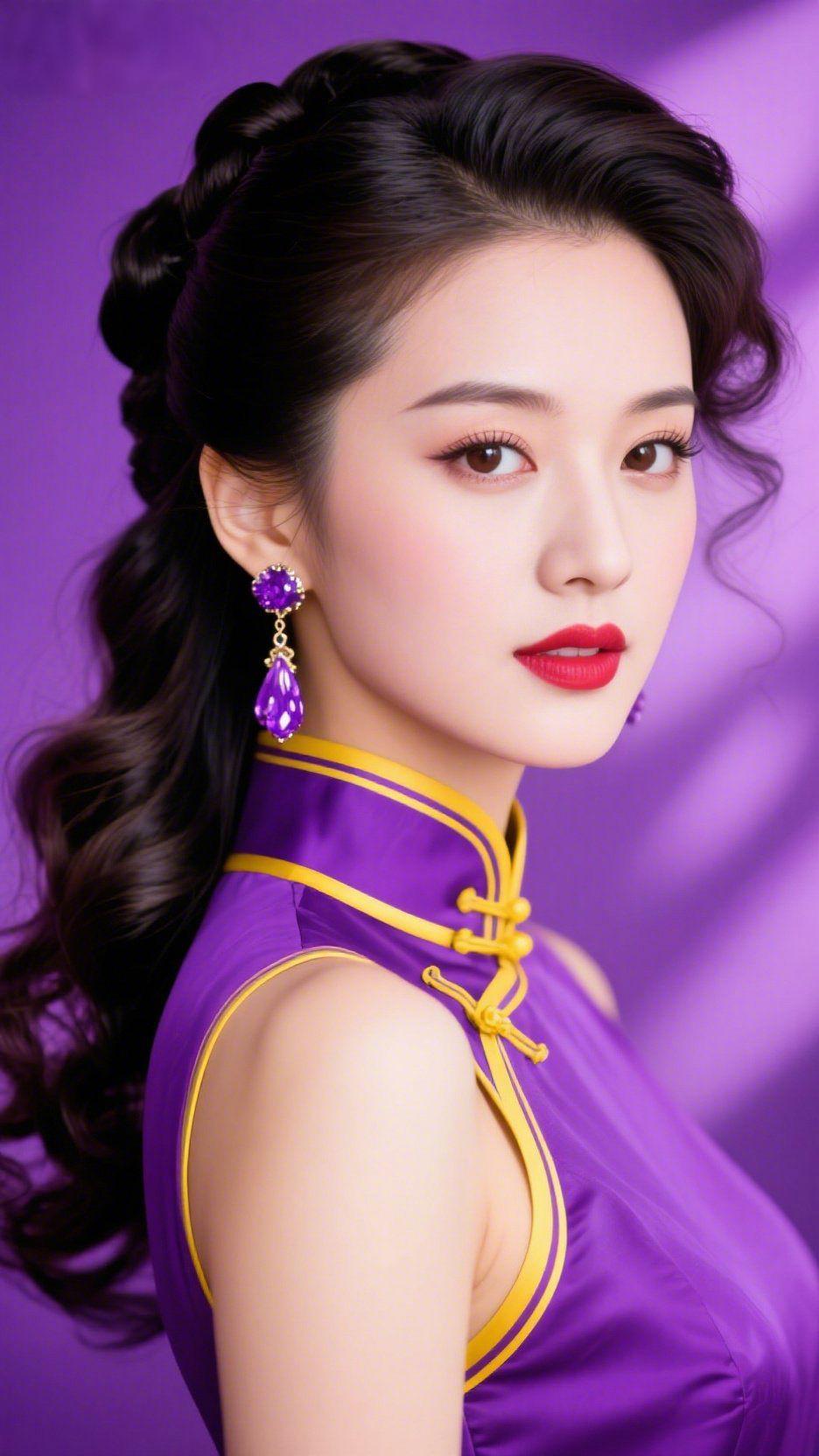《紫襟栖雅光》 淡紫缎面浸在柔光里,像揉碎的暮色织进襟衫,明黄盘扣坠着旧时光的软意,衬得肩线舒展温雅。 耳间紫晶随轻缓呼吸微晃,发尾卷涡裹着柔润弧度,唇间的红漫着从容韵致。我们总觉传统美是刻板精致,却忘了它藏着最舒展的温柔:比如襟衫垂落的柔和褶皱,比如此刻的神情,刚好接住岁月里的雅意。 不必刻意复刻旧韵,一件衬得心境舒展的衫,一抹自在的神情,便足够把寻常时刻,晕成时光里的雅致模样。 紫襟柔韵 时光轻雅