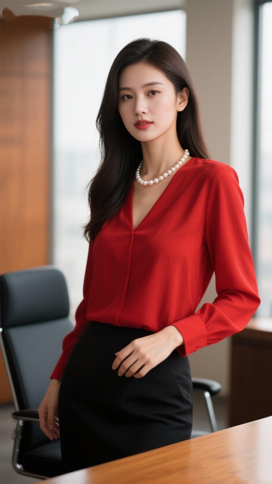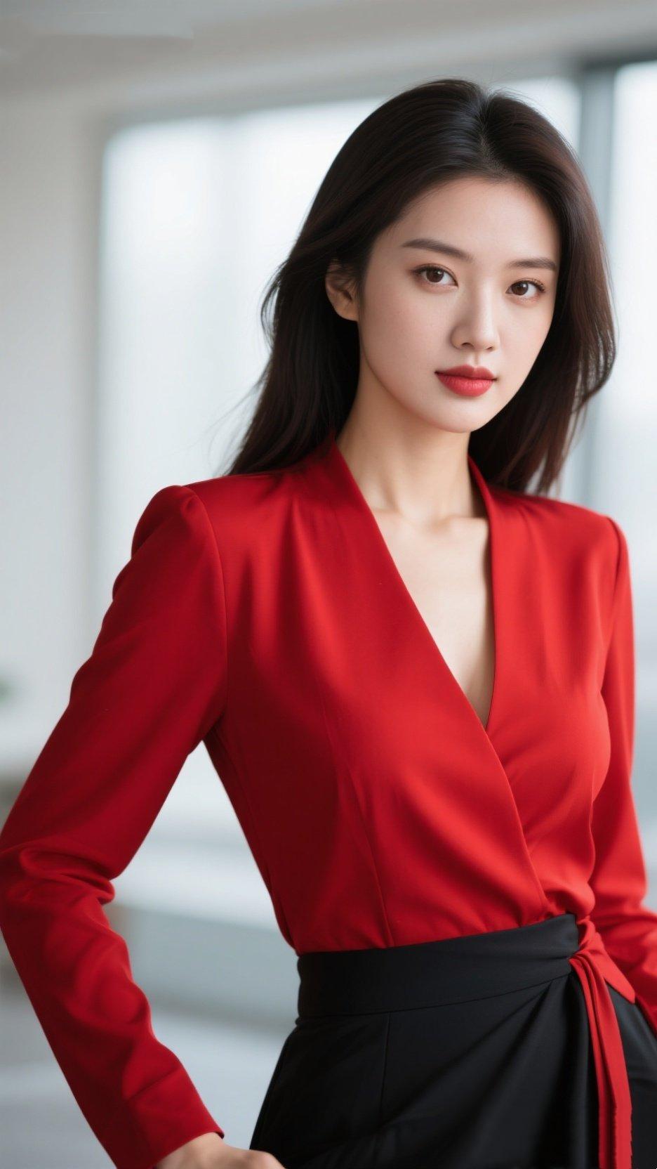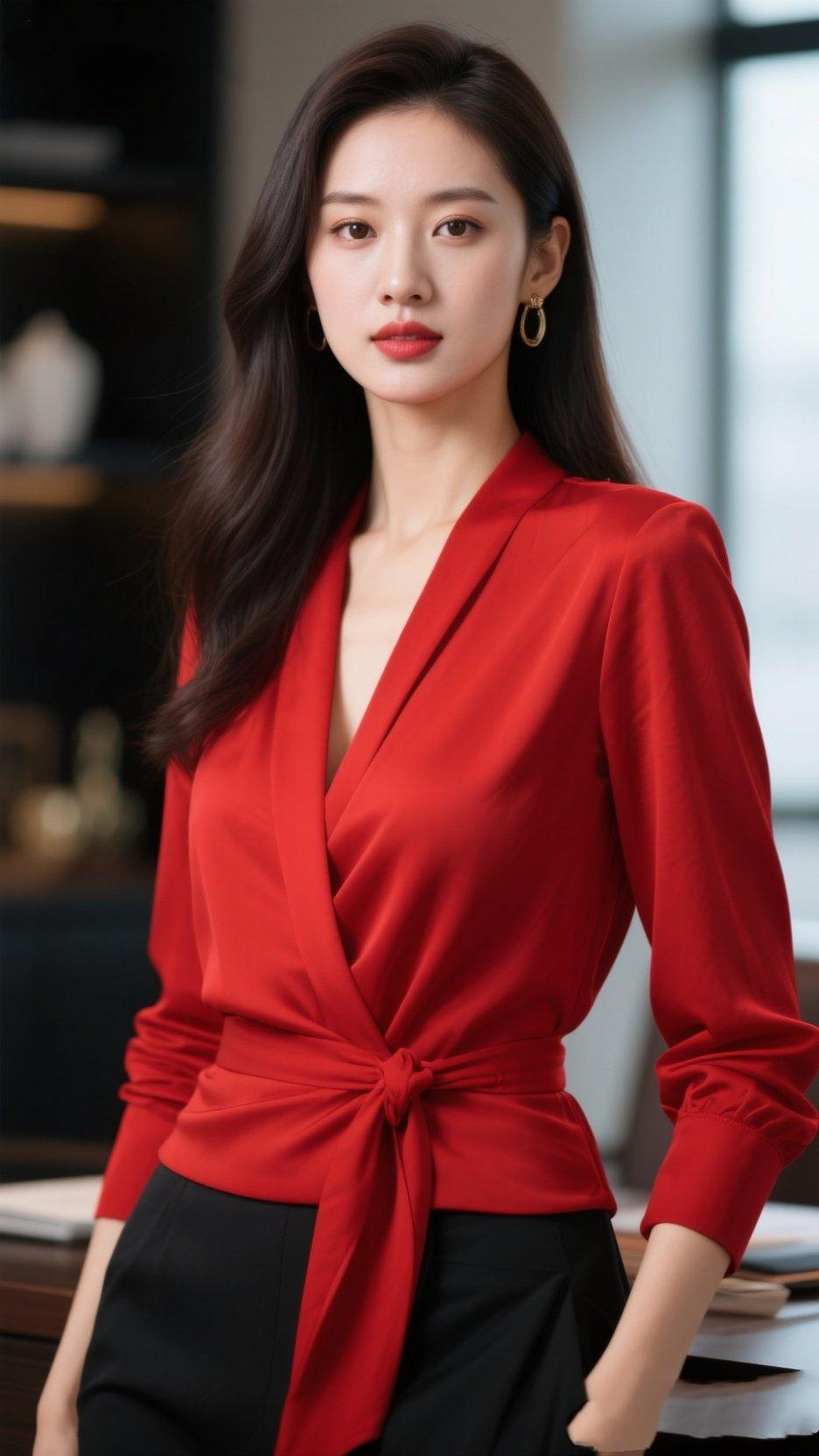 《红衫栖雅光》 室内的柔光轻落衣间,那抹红似揉碎的暖霞织进丝缎,衬着舒展的肩线,领口的弧度里裹着恰好的雅致。 耳间金饰随轻缓呼吸微晃,指尖交叠的姿态里,漫着松弛的从容。我们总将“精致”框进紧绷的范式,却忽略舒展才是最自然的舒展:比如衣身垂落的柔和褶皱,比如此刻的神情,刚好接住空间里的温软。 日子不必堆砌华丽,一件衬得心境舒展的衫,一抹自在的神情,便足够把寻常时刻,晕成从容的模样。 室间雅柔 红衫轻意
