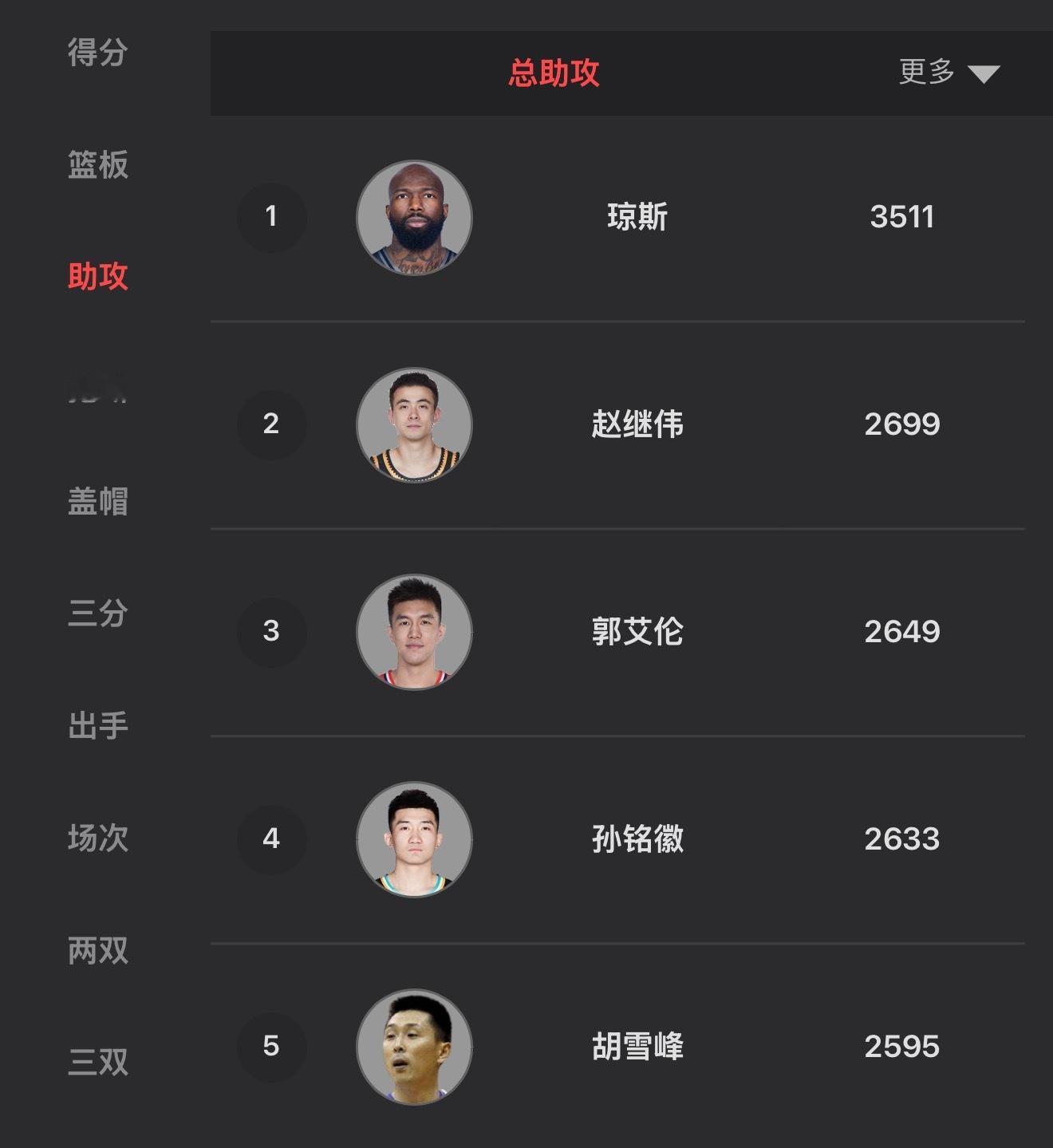 孙铭徽今天拿到13个助攻,他距离联赛历史助攻榜前三,越来越近了。cba