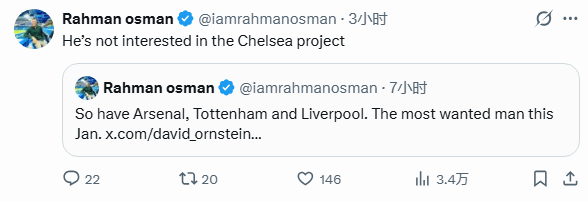 非常有意思的是,只有和伦敦地区的黑人球员关系很好的黑人记者RahmanOsman出来拆台,表示塞梅约对切尔西的项目没兴趣。