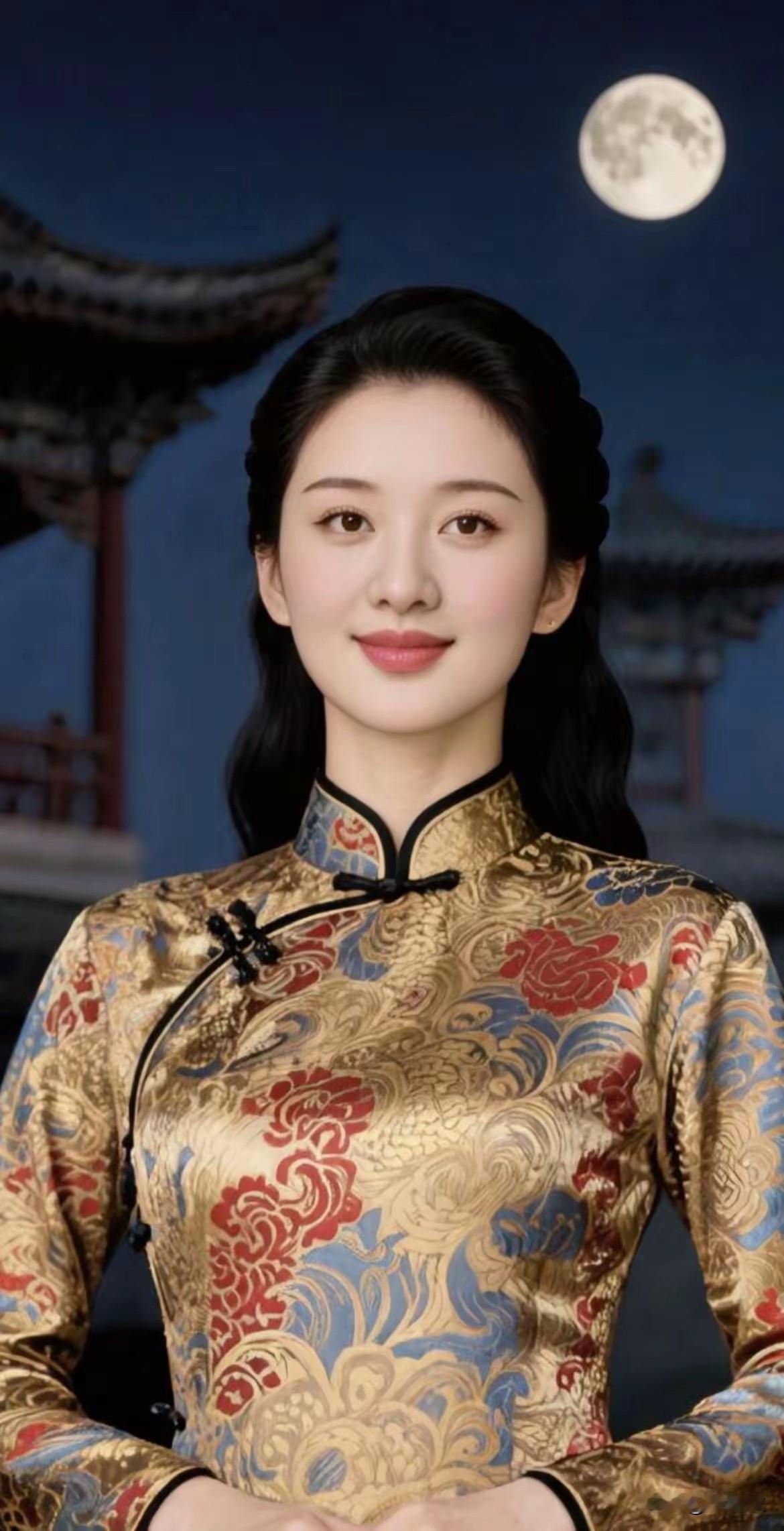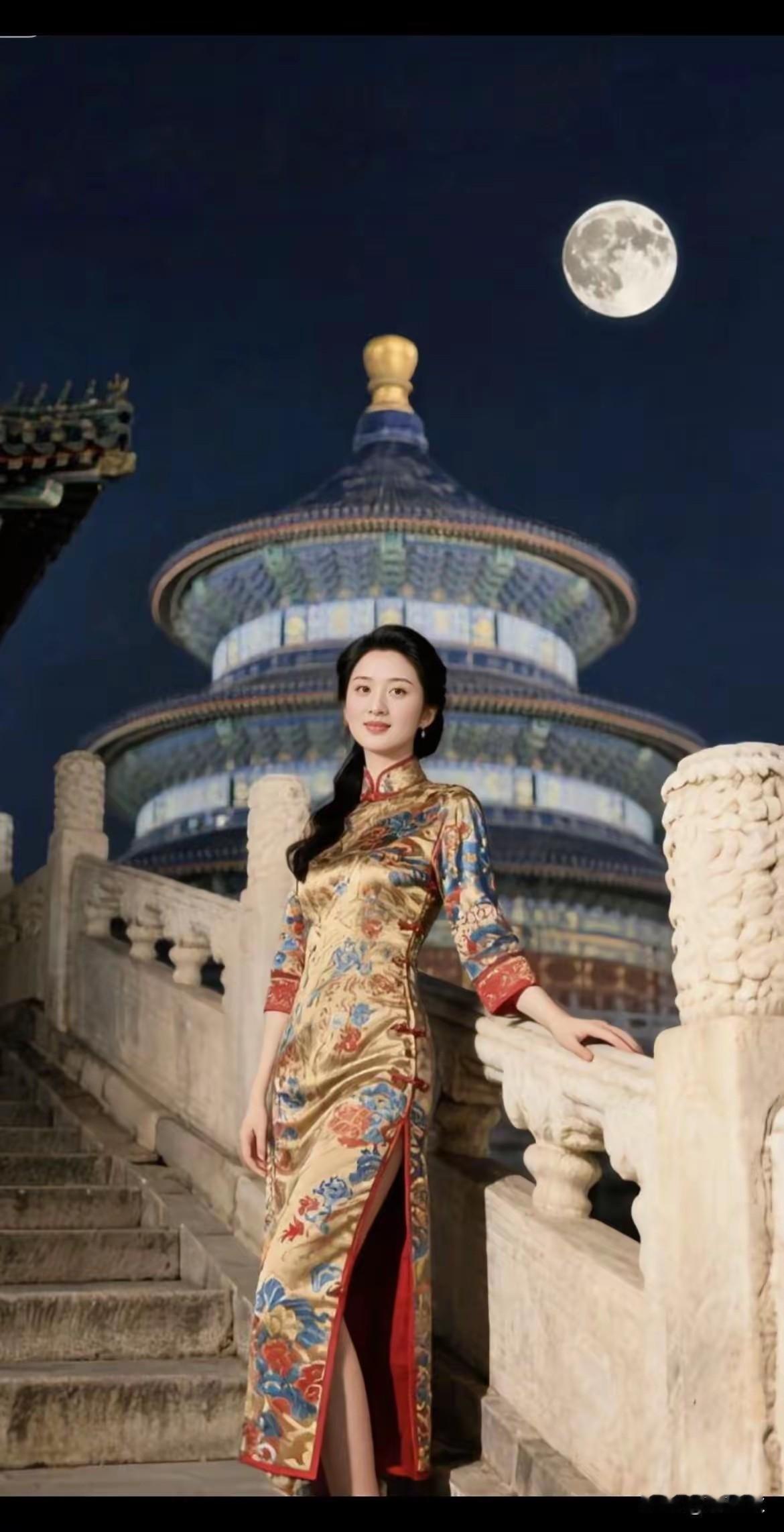 天坛月华,云锦旗袍 靓丽风景,囯风古韵 非遗传承 ,旗袍美人 雍容华贵,仪态万方 云纹暗织霓裳色, 一枕清光浸古风。