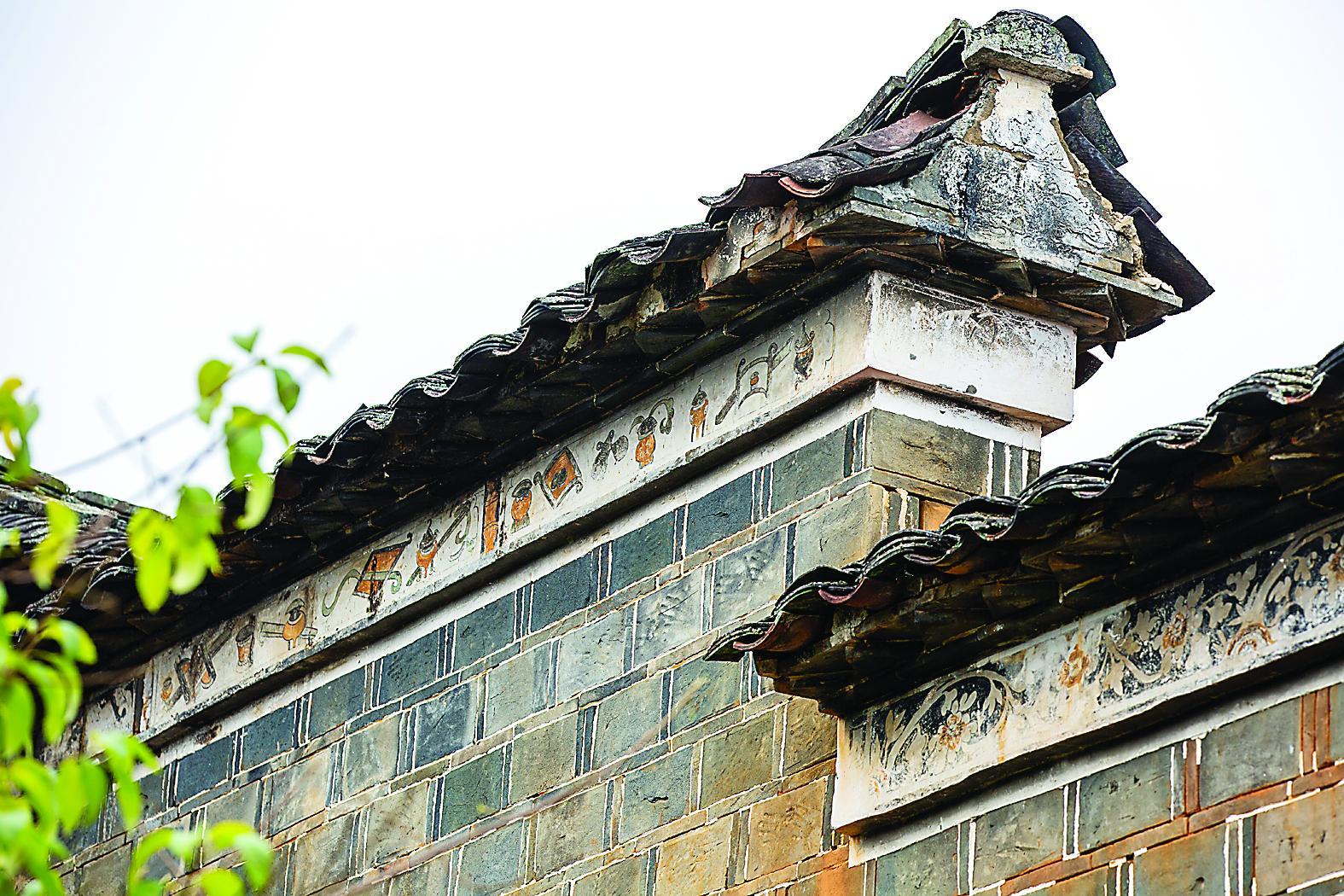 这是21日在武夷山市下梅村古民居拍摄的用岩彩绘成的装饰纹案,岩彩历经岁月洗礼,依旧保有鲜艳的色泽。