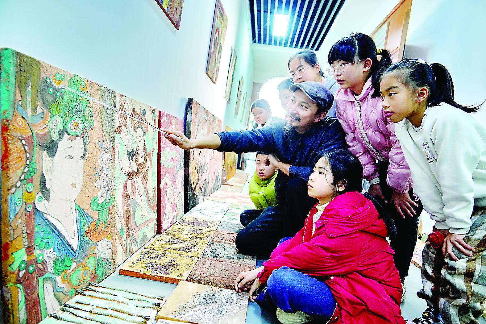 20日,参加武夷山市文化馆岩彩画公益课程的孩子们听老师讲解岩彩画作。