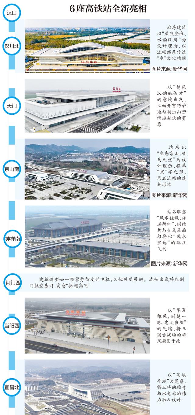 武宜高铁全线共设汉口、汉川北、天门、京山南、钟祥南、荆门西、当阳西、宜昌北8座车站,其中汉口站、荆门西站为既有车站,其余为新建车站。记者沿途探访发现,这些车站建筑各具特色,融入当地的文化基因与自然肌理。