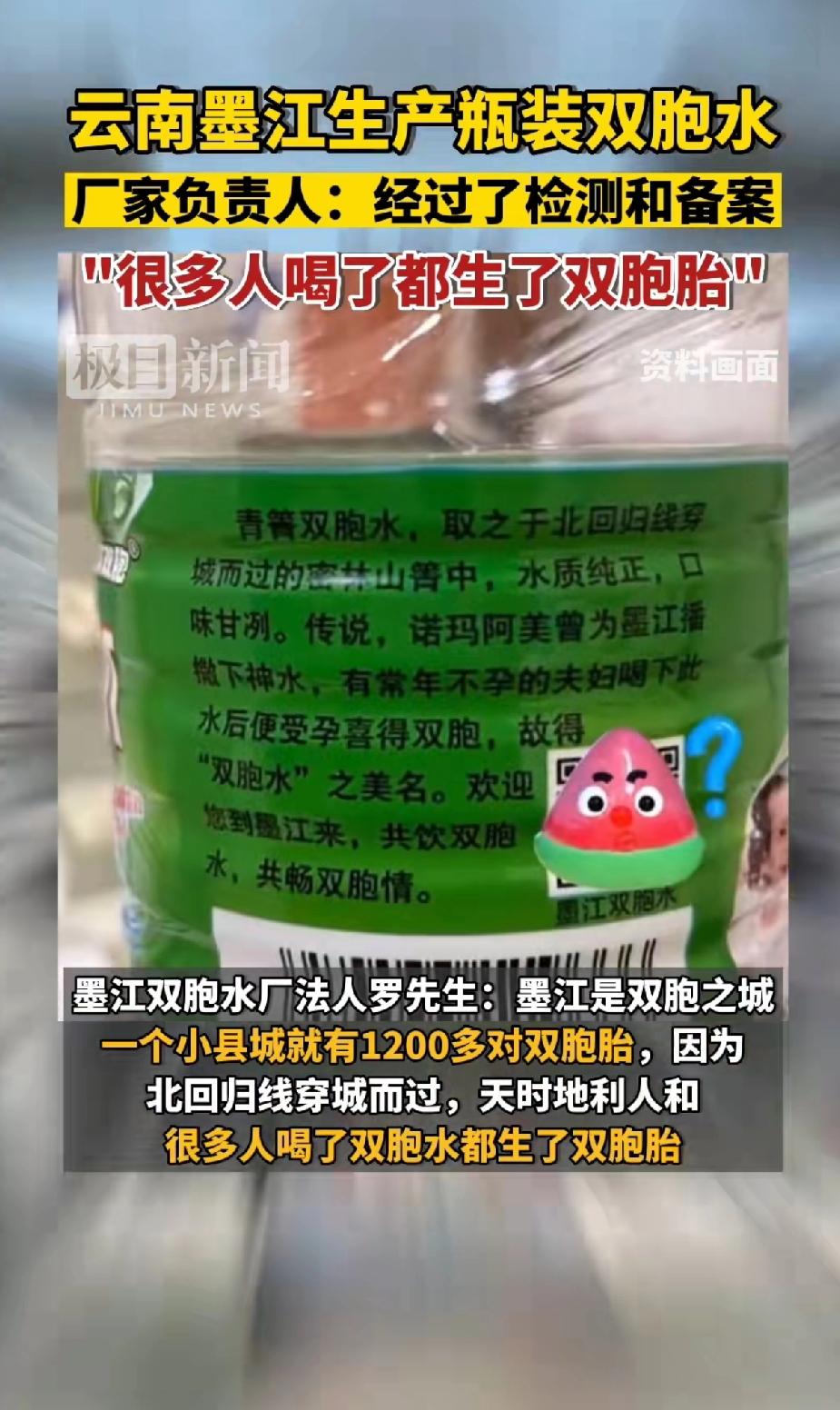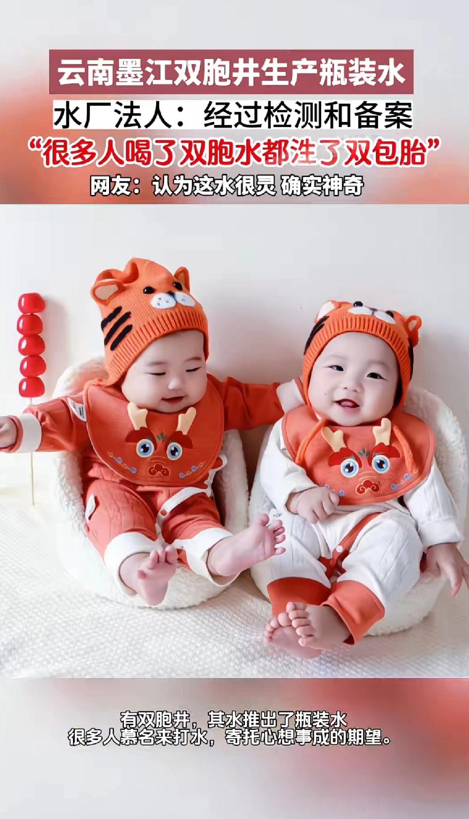 云南墨江双胞胎井生产瓶装水!水厂法人:经过检测和备案,还说很多人喝了都生了双胞胎。这说法一出来,网友们可炸开了锅。 从科学角度看,目前并没有确凿证据表明喝某种水就能直接导致生双胞胎。 但墨江本身就有“双胞胎之乡”的称号,这水的噱头就更大了。要是真有想生双胞胎的夫妻,估计会忍不住买来试试。 这个双胞胎井很多年前都报道过,因为北回归线穿城而过,占了天时地利人和的原因,加之当地盛产双胞胎,一个小县城就有1200多对双胞胎,当地村民认为是因喝了双子井的水导致的。 喝了这种水生双胞胎的概率会提高。 不过,大家也得理性看待,别把希望全寄托在这水上,毕竟生孩子这事,影响因素可太多啦。 当地人是男女双方,长期都饮用当地的水,才生的双胞胎。外地人过去,喝几次双子井的水就能生双胞胎,这个说法大家还是要理性看待。