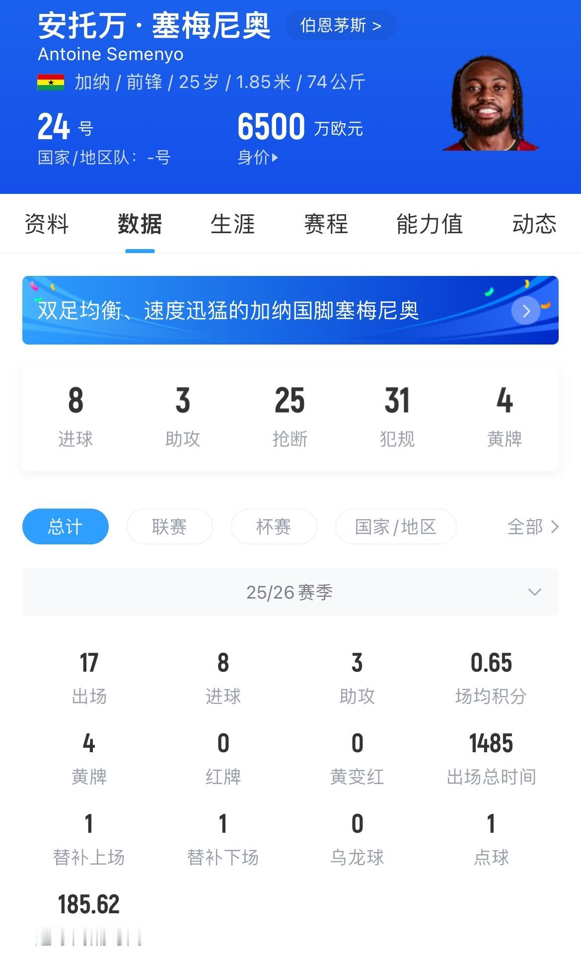 罗马诺:曼城正快速推进塞梅尼奥的签约,球员渴望获得冠军 12月24日 据罗马诺消息,曼城正在推进签约塞梅尼奥,预计未来几日完成。塞梅尼奥仍将曼城视为首选目的地,渴望获得冠军! 据消息:切尔西和热刺已退出竞争。目前,曼联还在极力争取,利物浦仍队球员保持关注