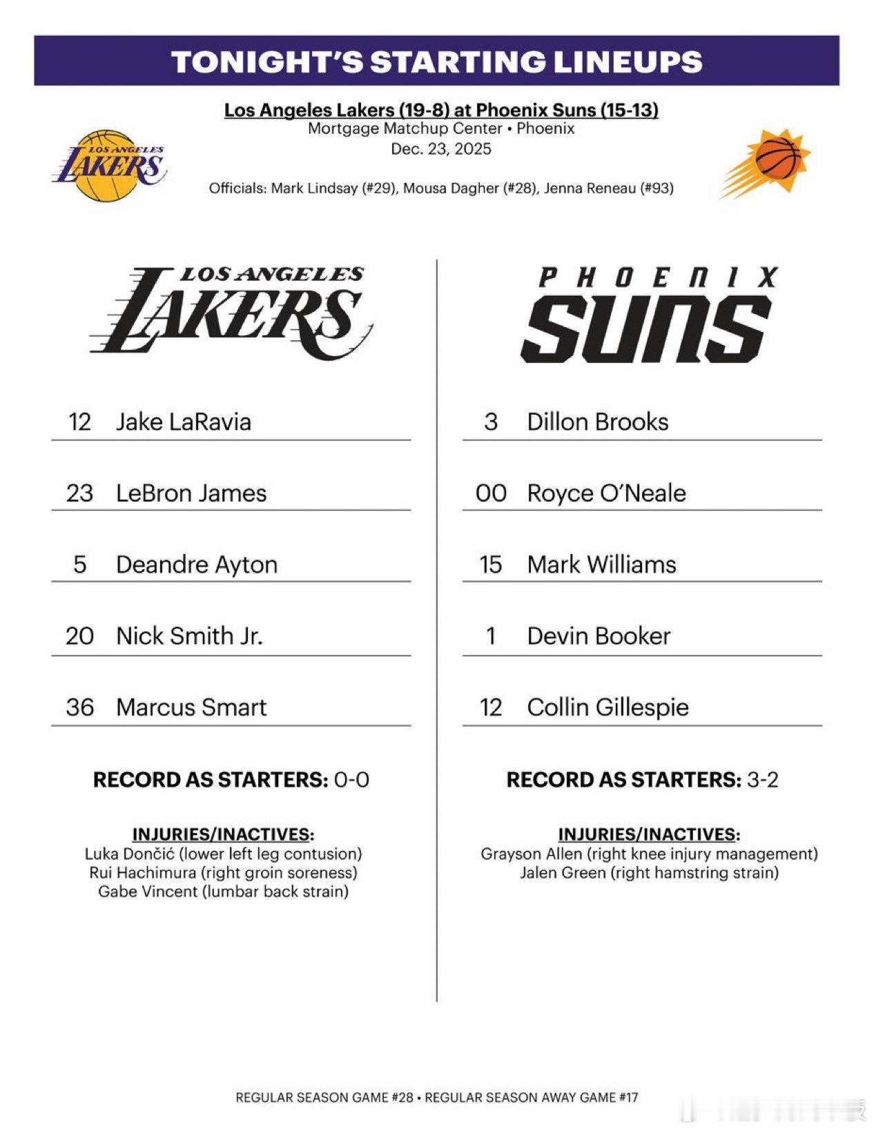 里夫斯替补出战!尼克-史密斯首发! 湖人首发: 斯玛特,尼克-史密斯,拉拉维亚,詹姆斯,艾顿! 太阳首发: 布克,吉莱斯皮,狄龙,罗伊斯-奥尼尔,马威湖人vs太阳