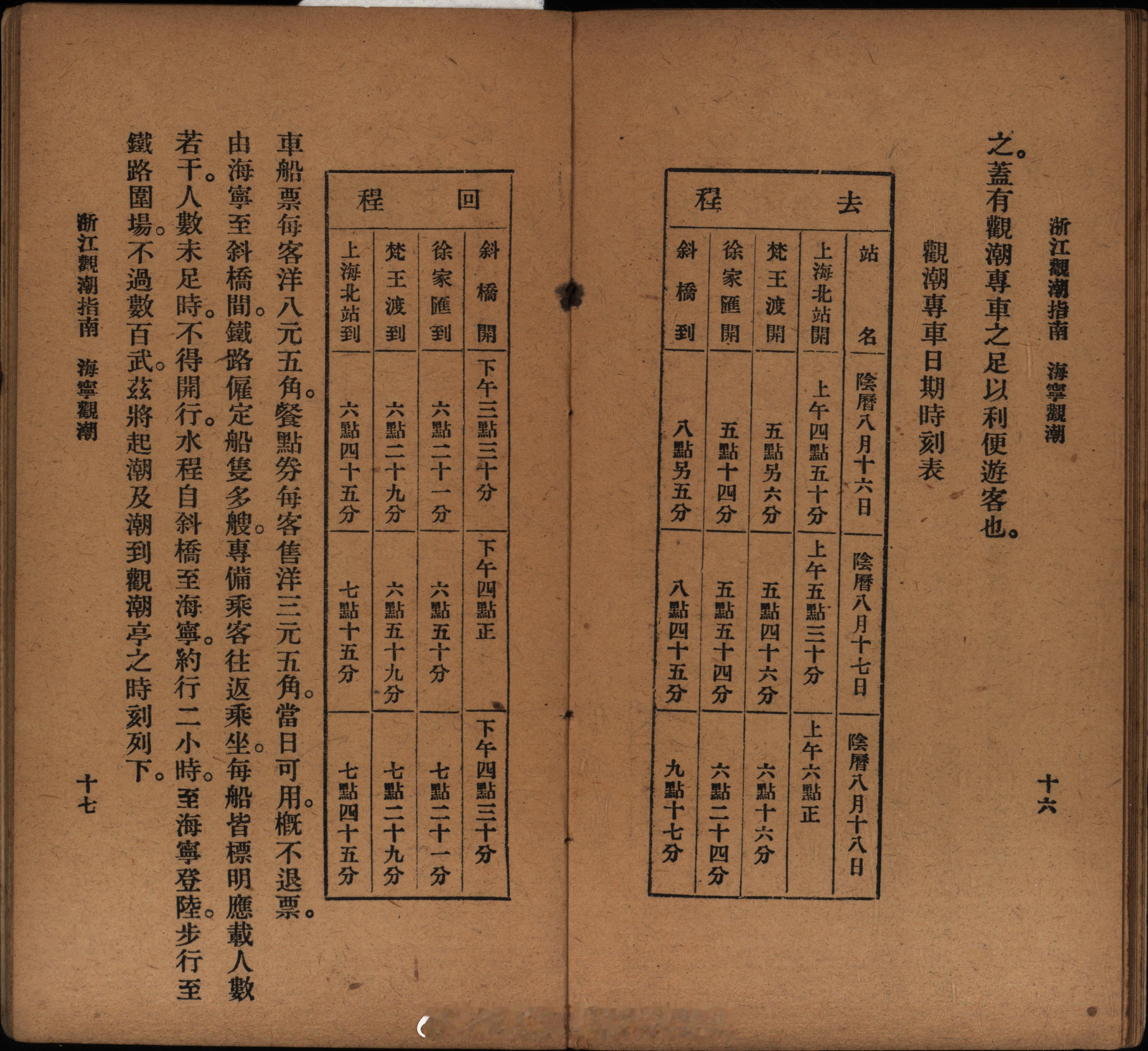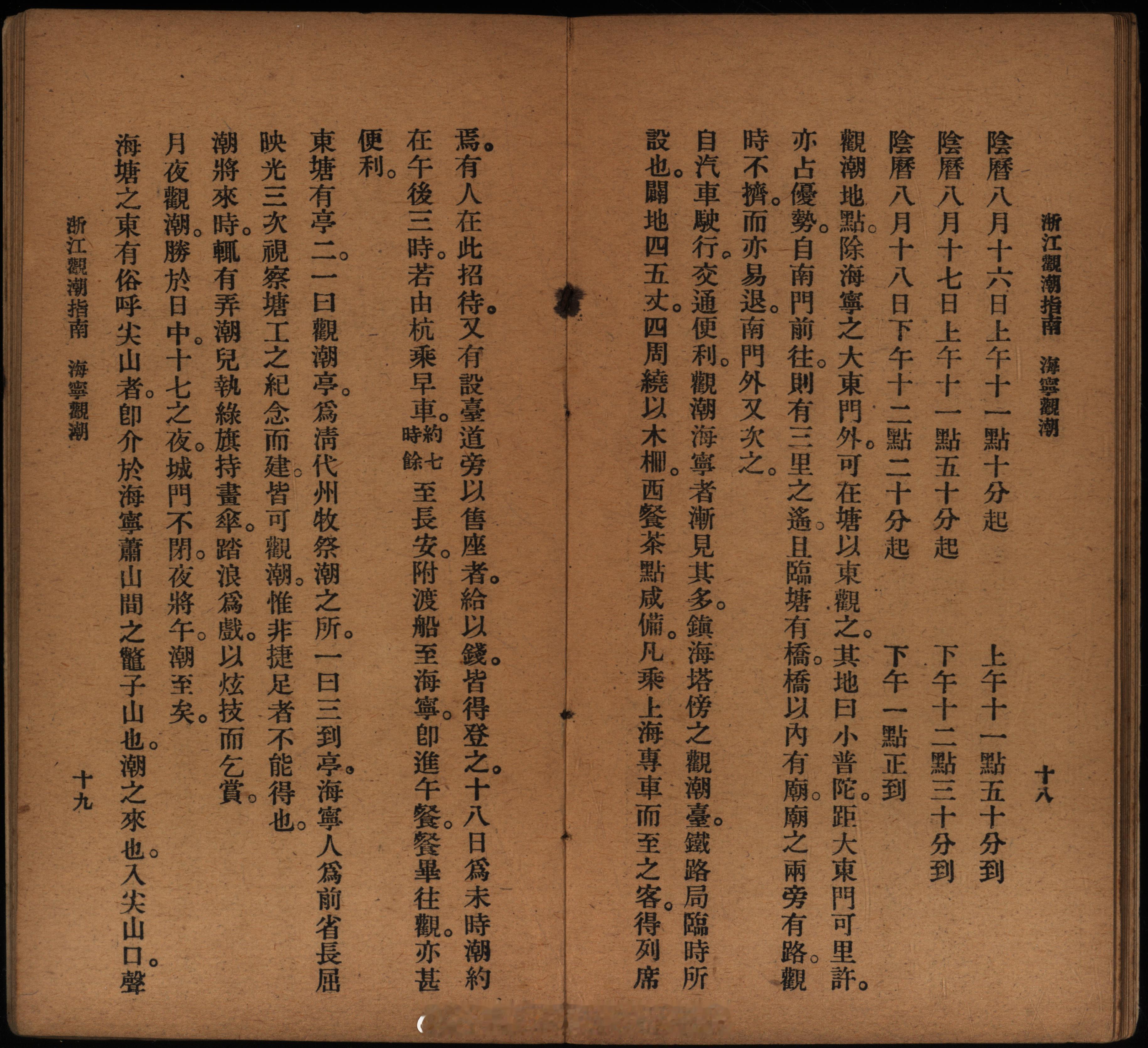 摩登行旅——近代长三角旅游文献展《浙江观潮指南》1929年7月上海商务印书馆出版书中介绍浙江潮的概况、神话历史、历代名人观潮诗文以及观潮专车日程表等内容。