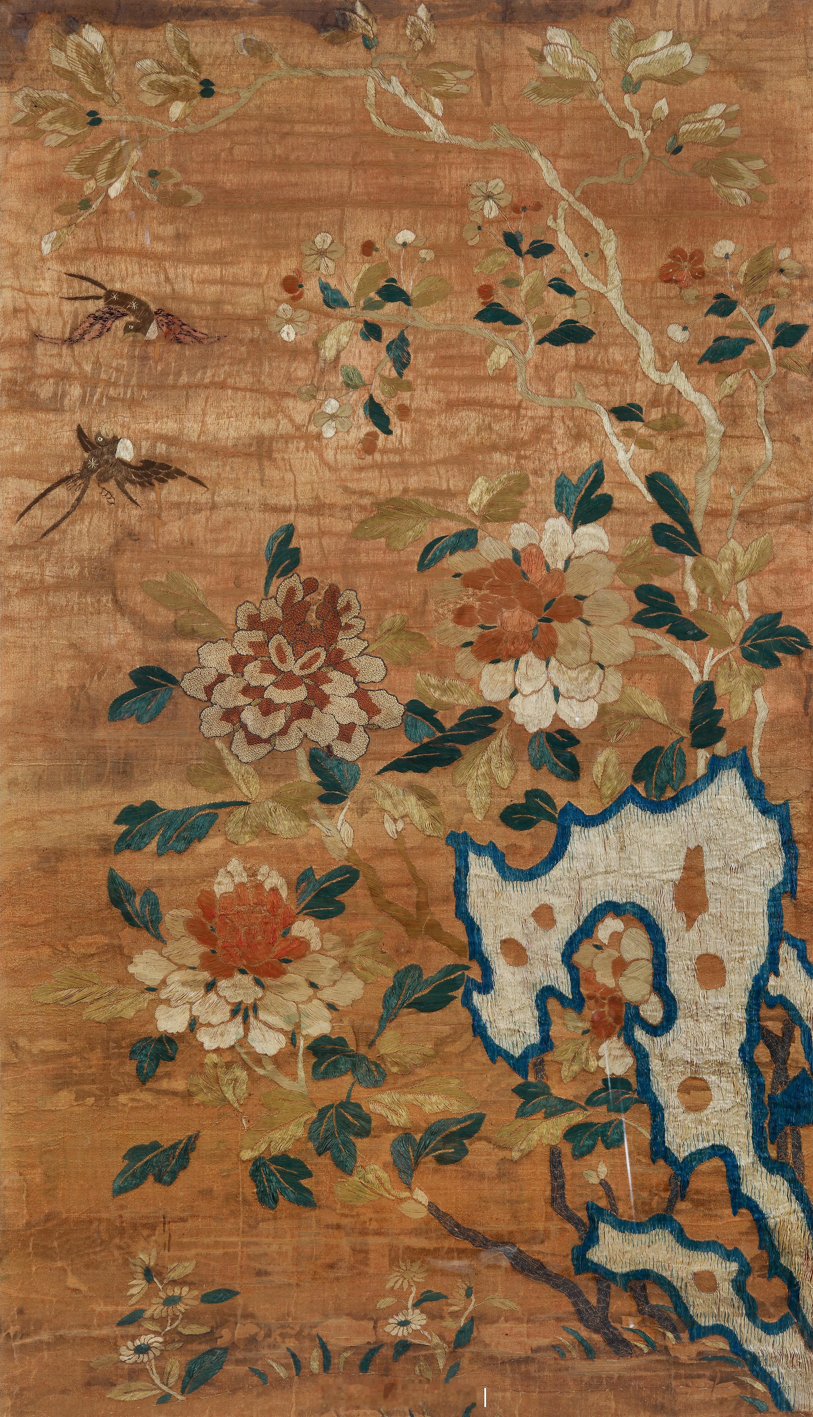 明 鲁绣花鸟图屏一对此对花鸟图屏,两屏各自成景,却气韵相契。其一绘紫藤、牡丹伴湖石而生,紫藤花穗垂落如瀑,牡丹绽放雍容华贵,湖石嶙峋奇崛,间有禽鸟穿梭花枝,生机盎然;另一屏则以玉兰、牡丹搭配湖石,玉兰皎洁舒展如琼枝,牡丹娇艳欲滴似霞锦,湖石形态古拙,两只飞鸟于花间翻飞,意趣横生。整体构图将花鸟、湖石、草木有机融合,既具文人画雅致意境,又有刺绣工艺之立体质感。尺寸:114×65cm来源:中贸圣佳2025秋季三十周年庆典拍卖会《集萃——古董珍玩专场》