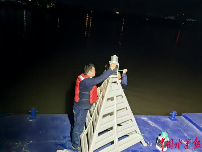 通济白浮是辖区核心助航标志,夜间灯光堪称船舶“指路明灯”,其故障可能引发船舶偏离航道、碰撞等风险。航行途中,江面寒风凛冽、夜色深沉,工作人员紧盯江面航道情况,谨慎操控船舶。抵达现场后,作业人员默契配合,在摇晃的甲板上快速完成固定航标、拆卸故障灯器、安装调试新设备等工序,克服风浪干扰,精准推进作业。
