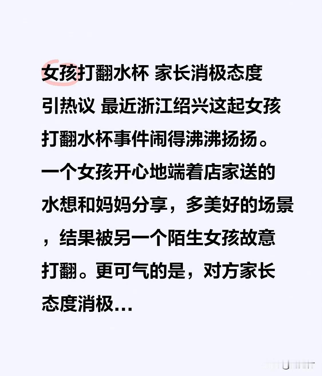 女孩打翻水杯 家长消极态度引热议 女孩打翻水杯,家长消极态度引热议 近日,浙江绍兴一起女孩打翻水杯事件引发广泛关注。一个女孩满心欢喜地端着店家送的水,打算与妈妈分享,画面温馨美好。然而,这一幕却被另一个陌生女孩故意打破,她直接将水打翻。更令人气愤的是,对方家长态度消极,径直带孩子离开,连一句道歉都没有。 受害女孩妈妈坚持要求对方合理道歉,这一做法值得称赞,为孩子树立了良好榜样。反观打翻水杯女孩的家长,错失了教育孩子承担责任的良机。长此以往,孩子可能会变得缺乏边界感和责任感。 此次事件如同一面镜子,映照出家庭教育的差距,值得所有家长深思。 家长的态度 家长态度恶劣 班主任怒砸水杯