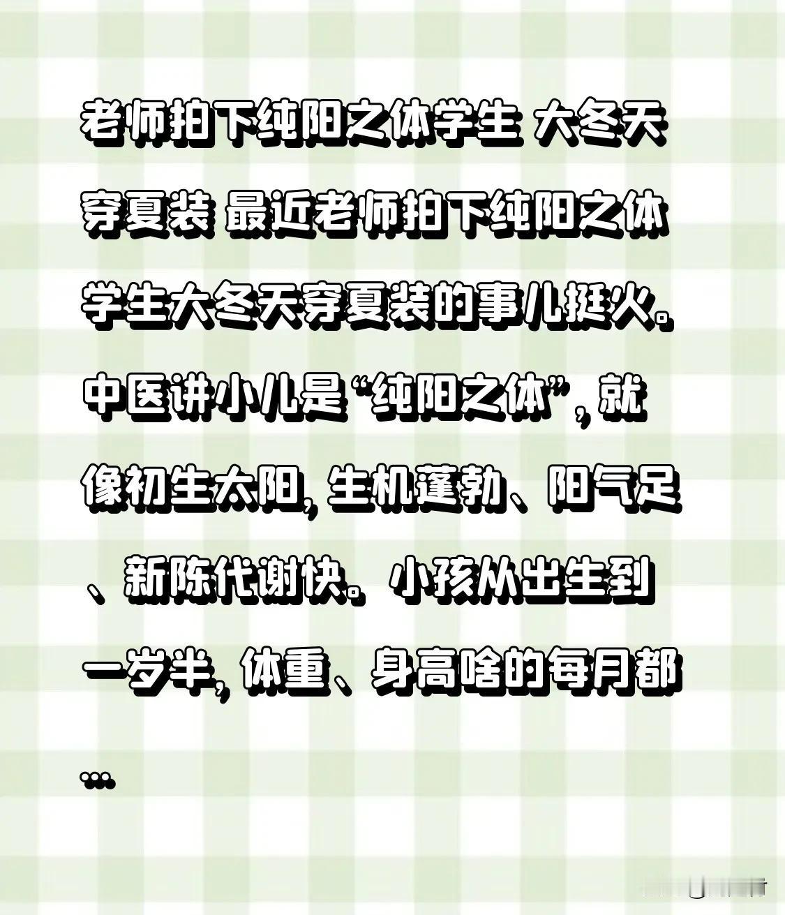 老师拍下纯阳之体学生 大冬天穿夏装 老师拍下纯阳之体学生大冬天穿夏装一事最近很火。中医认为小儿是“纯阳之体”,如同初生的太阳,生机蓬勃、阳气充足、新陈代谢快。小孩从出生到一岁半,体重、身高每月都有变化。 这学生大冬天穿夏装,可能是体热所致。他们生长发育快,好似奋力生长的小树苗,需要大量营养。不过,这也容易使脾的运化跟不上肝气生发,导致脾的功能受损。所以,家长了解“纯阳之体”,养护孩子时就能更有针对性,别因孩子不怕冷就掉以轻心。 纯阳食物 儿童温差穿搭 纯阳之人 纯阳体修行法