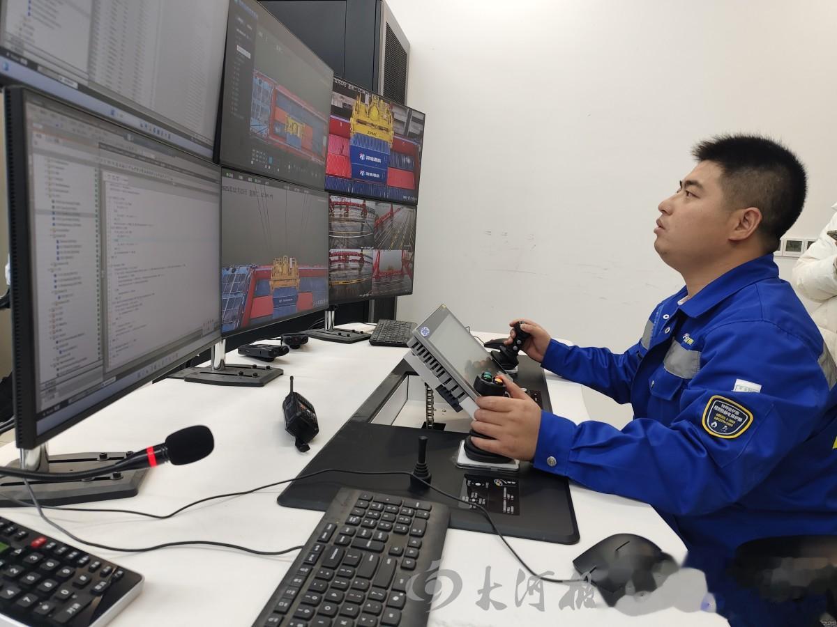 原来,“秘密”藏在数百米外的办公大楼内。坐在控制台前,年轻的岸桥设备操作员张闪双眼紧盯着显示码头实时画面的屏幕和各项数控指标,他只需在室内操纵挡杆,就可实现“隔空装船”。