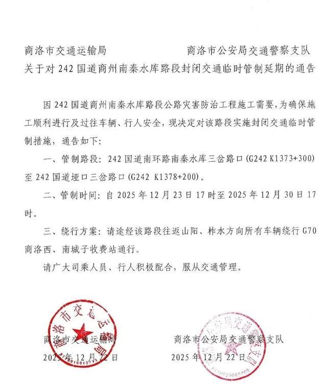 关于对242国道商州南秦水库路段封闭交通临时管制延期的通告