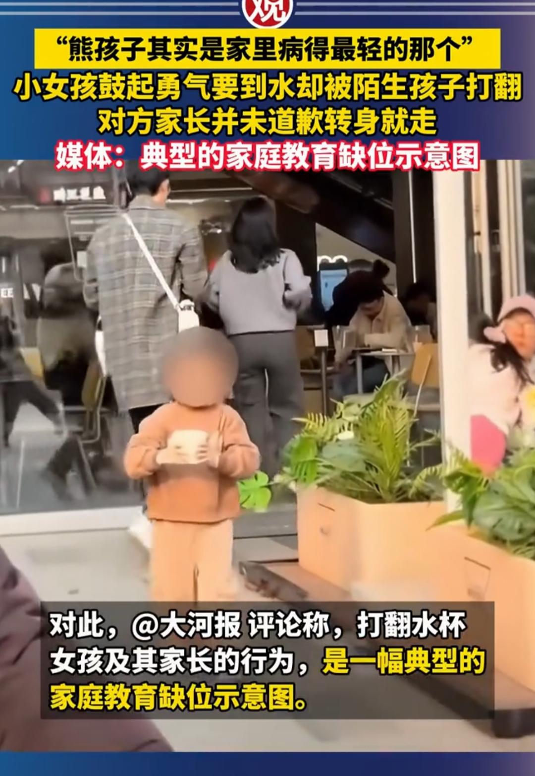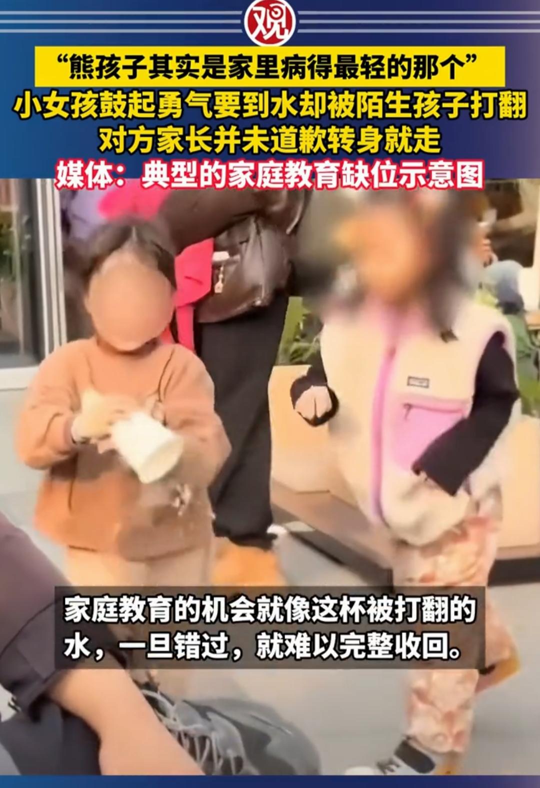 一杯水打翻家教真相:家长的态度,才是孩子的人生底色 浙江商场里的一幕刷爆全网:7岁女孩第一次独自端温水给妈妈,却被同龄孩子突然打翻,涉事家长仅轻飘飘一句“孩子闹着玩”,便带着孩子转身离去,全程没有道歉,更无安抚。这杯泼洒的温水,不仅打湿了地面,更照出了家庭教育的核心命题——孩子犯错不可怕,家长的消极态度才最致命。 网友的热议戳中要害:有人痛斥“熊孩子背后必有熊家长”,认为家长的冷漠实则是纵容孩子“犯错无需负责”;也有人共情被泼水女孩的妈妈,她没有争吵,而是先蹲下来检查孩子是否烫伤,再通过报警让孩子明白“对错有边界,权益需维护”。两种截然不同的态度,早已为孩子的人生埋下伏笔。 儿童心理学家指出,7-10岁是孩子建立责任意识的关键期,打翻水杯、碰撞他人这类“小事”,正是教会孩子共情与担当的最佳契机。家长的消极应对,无论是冷漠回避还是敷衍辩解,本质上是错失了教育的黄金时刻,更是在无声传递“错误可以逃避”的扭曲认知。久而久之,孩子会丧失面对问题的勇气,甚至养成漠视规则、推卸责任的性格。 真正的家庭教育,从不是替孩子遮风挡雨,而是教会他们直面风雨。当孩子犯错时,一句温和的“没关系,我们一起解决”,比指责更有力量;一次共同清理的行动,比说教更能培养担当;一场平等的复盘交流,比逃避更能塑造品格。 这杯打翻的水终会干涸,但家长态度留下的印记,却可能伴随孩子一生。家庭教育的本质,是家长用自身的言行,为孩子搭建起规则与善意的框架。你如何对待孩子的失误,孩子就会如何对待这个世界。 如果你的孩子打翻了别人的水杯,你会第一时间怎么做?欢迎在评论区留言!教育真相 家长的态度