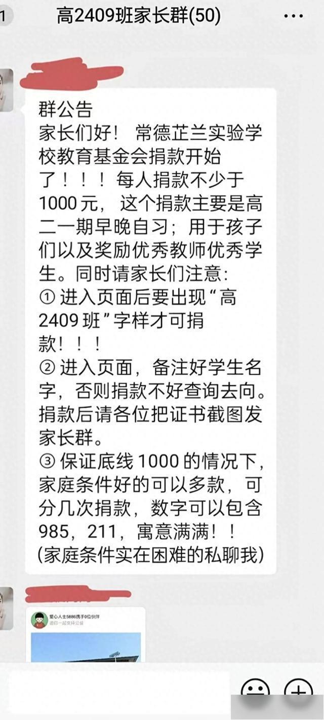 12月22日,湖南常德芷兰实验学校一家长群中,有人号召家长为学校捐款。该通知发布人称,保底捐1000元,条件允许可以多捐,捐款用于晚自习费用及奖励优秀师生。