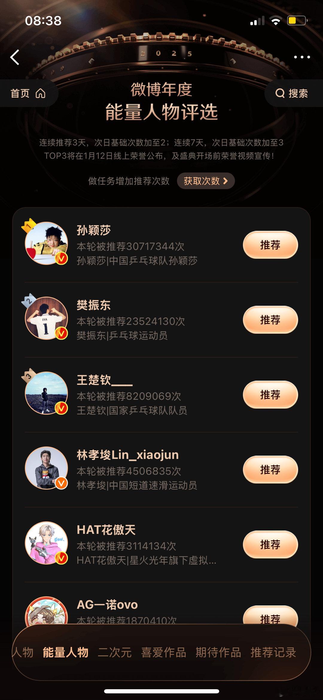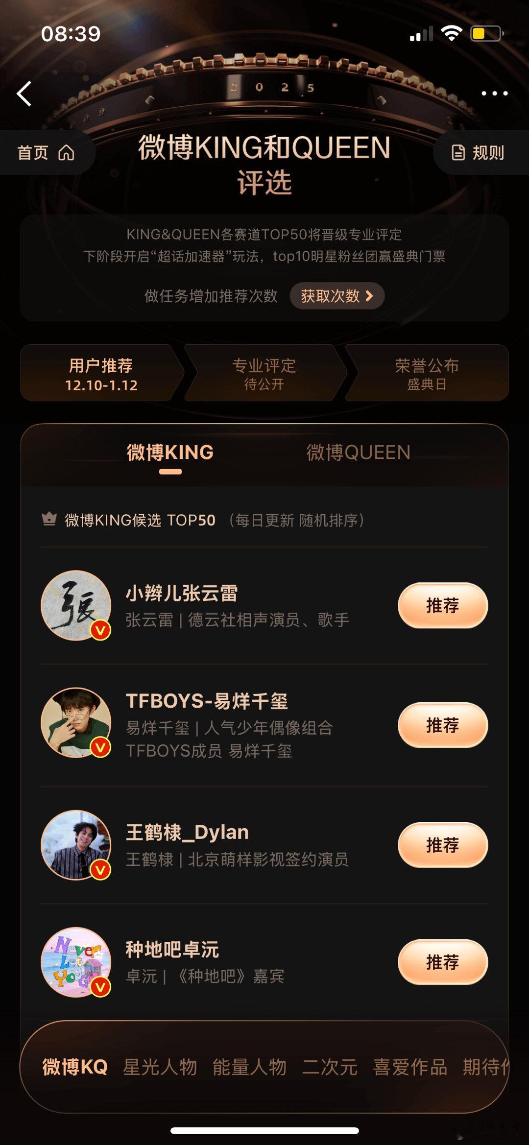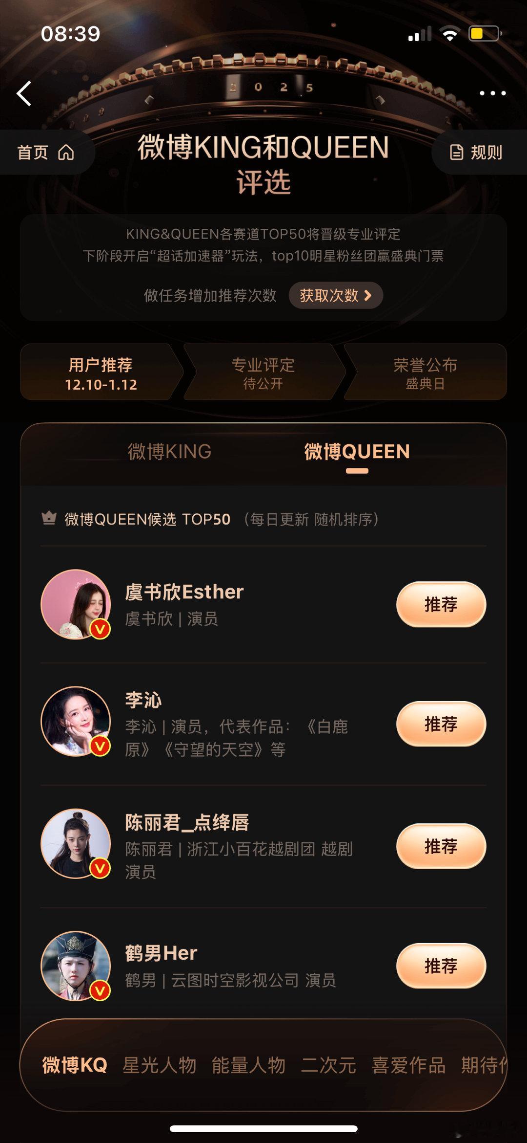 微博之夜投票内娱年末狂欢杀疯了!进阶赛段票数重置后竞争更白热化,肖战冲击三封King稳坐前排,杨紫向四连Queen发起冲刺,梓渝、田栩宁等新生代断层领跑,体育圈、二次元赛道也强势破圈。投票不再是单纯数据比拼,粉丝一边精准完成超话互动、公益联动解锁票数,一边借热度安利偶像作品;路人则为情怀投票,让意难平的荧幕CP再逐荣光。每一票都是热爱的见证,是对努力与坚守的认可,这场流量与实力的双向奔赴,太让人期待最终加冕时刻~微博之夜KingQueen预测