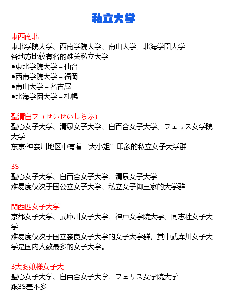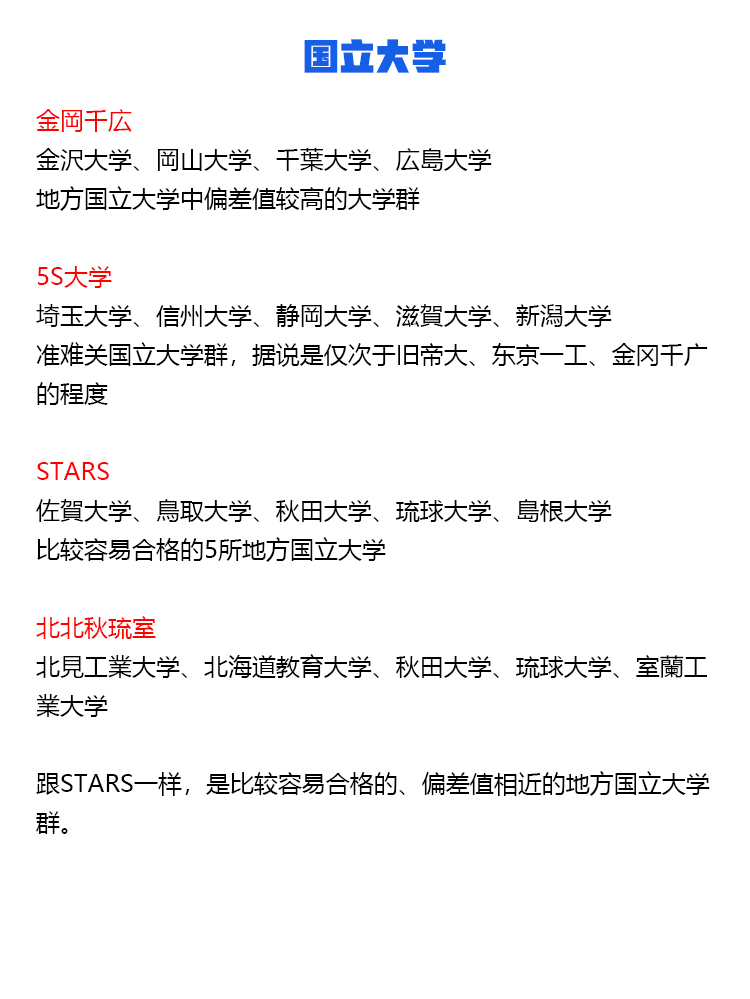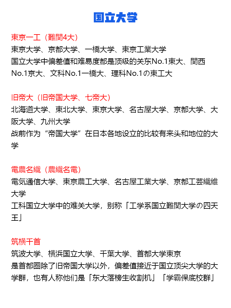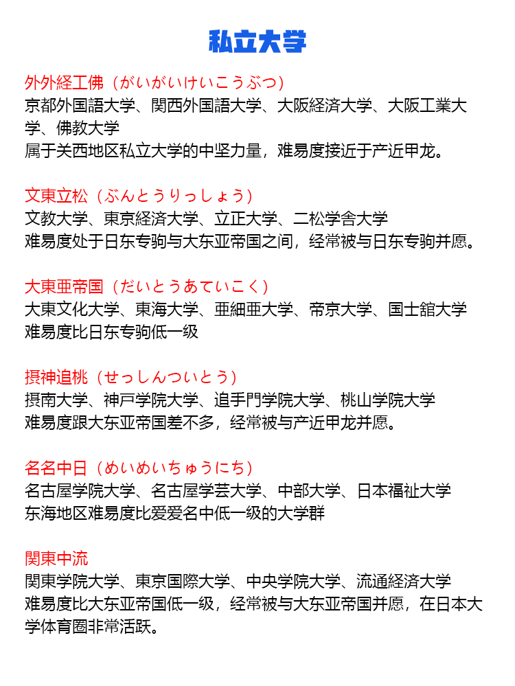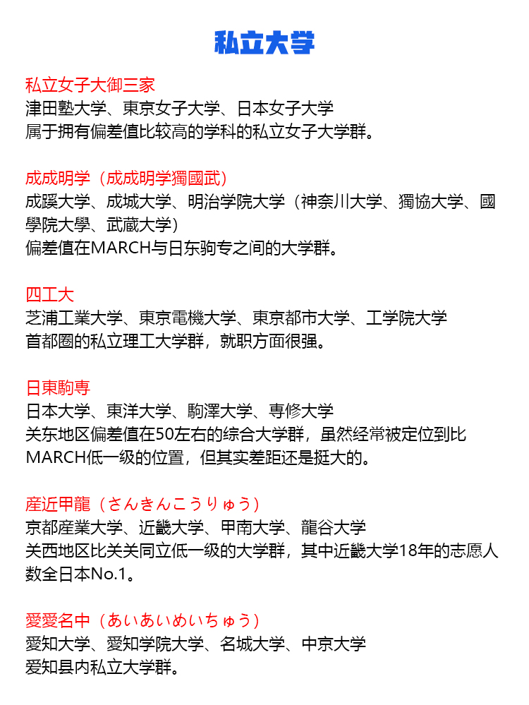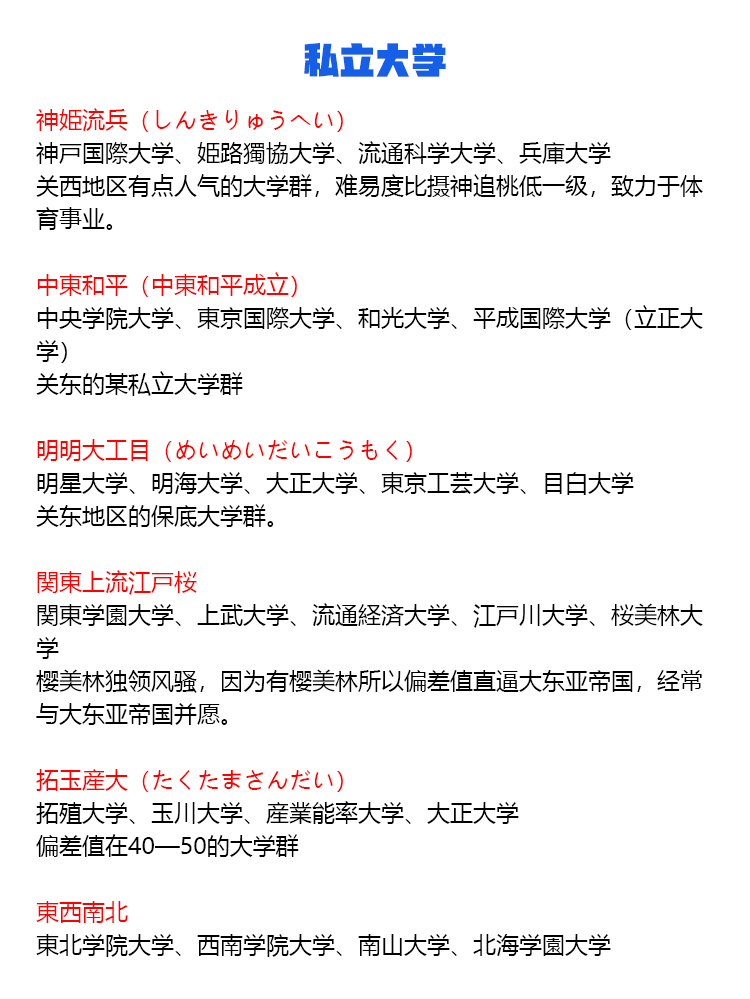 国立大学 東京一工(難関4大) 旧帝大(旧帝国大学、七帝大) 電農名繊(農繊名電) 筑横千首 金岡千広 5S大学 STARS 北北秋琉室 地方国立大学(駅弁大学) 【東北】弘前大学、岩手大学、秋田大学、山形大学、福島大学 【関東】茨城大学、宇都宮大学、群馬大学、埼玉大学、千葉大学、横浜国立大学、山梨大学 【中部】新潟大学、富山大学、金沢大学、福井大学、信州大学、岐阜大学、静岡大学、三重大学 【近畿】滋賀大学、神戸大学、和歌山大学 【中国】鳥取大学、島根大学、岡山大学、広島大学、山口大学 【四国】徳島大学、香川大学、愛媛大学、高知大学 【九州】佐賀大学、長崎大学、熊本大学、大分大学、宮崎大学、鹿児島大学、琉球大学 旧六医大 旧二文理大 旧三商大(三大商科大学) 国公立女子大学 私立大学 早慶(早慶上智、早慶上理) SMART JAL(JRA) MARCH(GMARCH) 関関同立 東京四大学 私立女子大御三家 成成明学(成成明学獨國武) 四工大 日東駒専 産近甲龍(さんきんこうりゅう) 愛愛名中(あいあいめいちゅう) 外外経工佛(がいがいけいこうぶつ) 文東立松(ぶんとうりっしょう) 大東亜帝国(だいとうあていこく) 摂神追桃(せっしんついとう) 名名中日(めいめいちゅうにち) 関東中流 神姫流兵(しんきりゅうへい) 中東和平(中東和平成立) 明明大工目(めいめいだいこうもく) 関東上流江戸桜 拓玉産大(たくたまさんだい) 東西南北 聖清白フ(せいせいしらふ) 3S 関西四女子大学 3大お嬢様女子大
