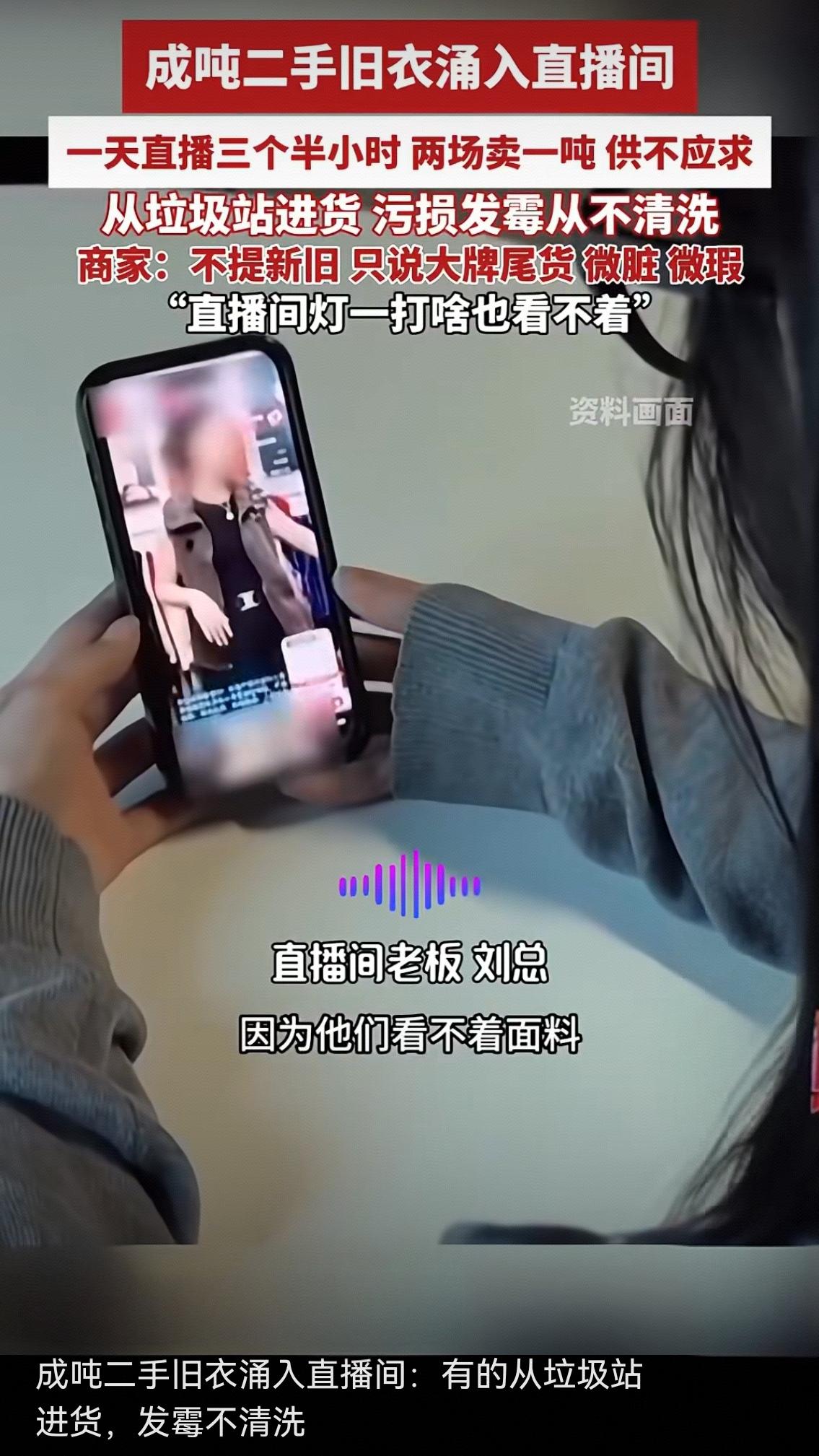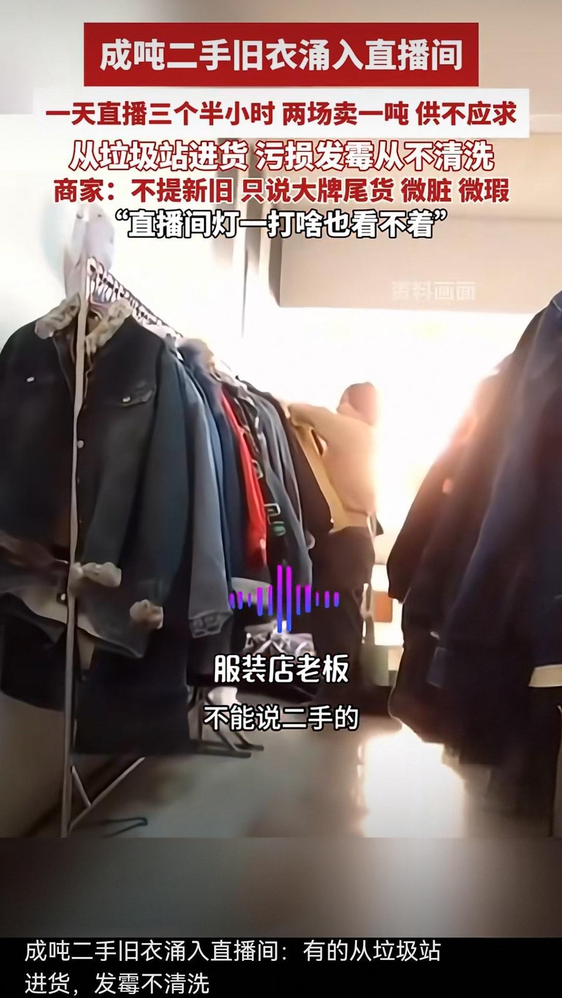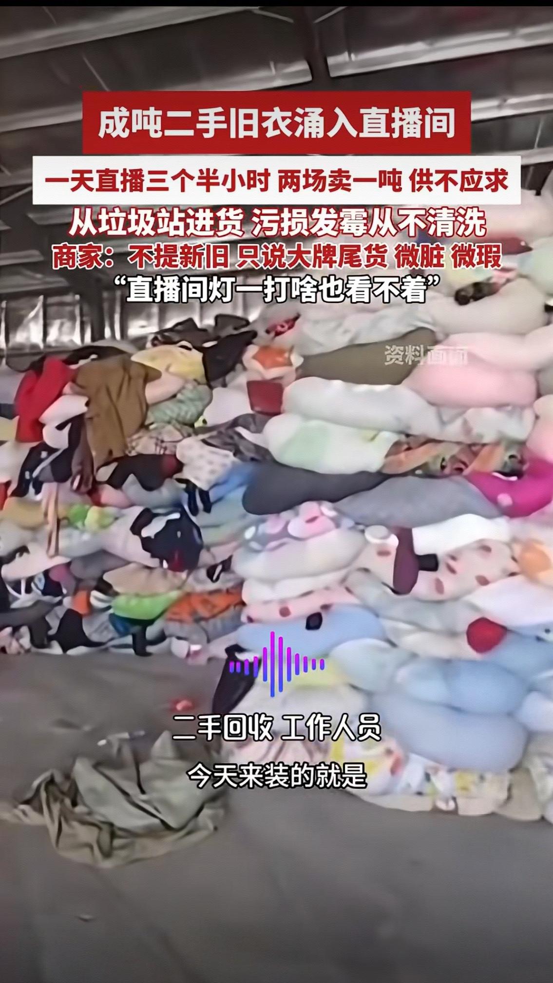 成吨二手旧衣涌入直播间:6元3件的“大牌尾货”,竟是垃圾站捡来的脏衣服? 成吨二手旧衣涌入直播间,一天直播三个半小时两场卖一吨,订单排到一周后,商家嘴里的“大牌尾货”“微脏微瑕”,藏着最扎心的真相——这些衣服根本不是什么尾货,而是从垃圾站、公益回收箱里搜罗来的旧衣,连清洗消杀都省了,全靠直播间的灯光和美颜“遮丑”。 你以为捡漏的几十元“孤品样衣”,可能带着陌生人的汗渍、粉底印,甚至发霉的霉斑。有消费者拆开快递,不仅发现领口发黄、裙摆沾着油渍,还在口袋里掏出过零钱、耳钉和瓜子壳,这哪里是尾货,分明是别人穿剩的“二手垃圾” 。更可怕的是,这些衣服在分拣仓库里随意堆在水泥地上,只用破布简单覆盖,空气中弥漫着腐朽气味,蟑螂卵、虫卵随处可见,商家却直言“不用洗,洗了就没利润了”。 最让人愤怒的是整个链条的欺骗性。小区里贴着“公益捐赠”的回收箱,本是大家传递爱心的渠道,却成了不法商家的“免费货源”,他们把居民捐赠的衣物低价收走,转身就包装成“大牌尾货”牟利 。华南地区的翻新工厂更狠,用刺鼻的化学药剂擦掉污渍,挂上几块钱就能买到的假吊牌,瞬间让旧衣变身“新品”,连行业主播都坦言“没有行家带路,根本拿不到这些翻新货”。 直播间里,主播拿着沾着霉斑的衣服侃侃而谈,“微瑕不影响穿着,大牌同款闭眼冲”,美颜滤镜下,污渍和破损全被隐藏,消费者隔着屏幕根本看不出端倪。更过分的是,商家还标注“默认为瑕疵品,不退不换”,把霸王条款写得明明白白,一旦消费者发现问题,维权之路难上加难 。更让人揪心的是,连儿童衣物也没能幸免,这些未经消毒的旧衣,对免疫力低下的孩子来说,简直是细菌传播的“温床”,极易引发皮肤过敏甚至感染。 其实大家追求高性价比没错,但不该为商家的欺诈买单。那些打着“尾货”“清仓”旗号的低价直播间,背后可能藏着卫生隐患和道德缺失。消费者花的是真金白银,买的却可能是危害健康的“问题衣”,而捐赠者的爱心,也被当成了商家牟取暴利的工具。 监管部门早该出手整治这条灰色产业链,平台更不能置身事外,毕竟直播间不是法外之地。而我们作为消费者,遇到“6元3件”“大牌低价清仓”的诱惑时,多一份警惕,少一份侥幸,就是对自己健康的负责。你有没有在直播间买到过货不对板的“尾货”?欢迎在评论区分享你的经历,提醒更多人避坑!
