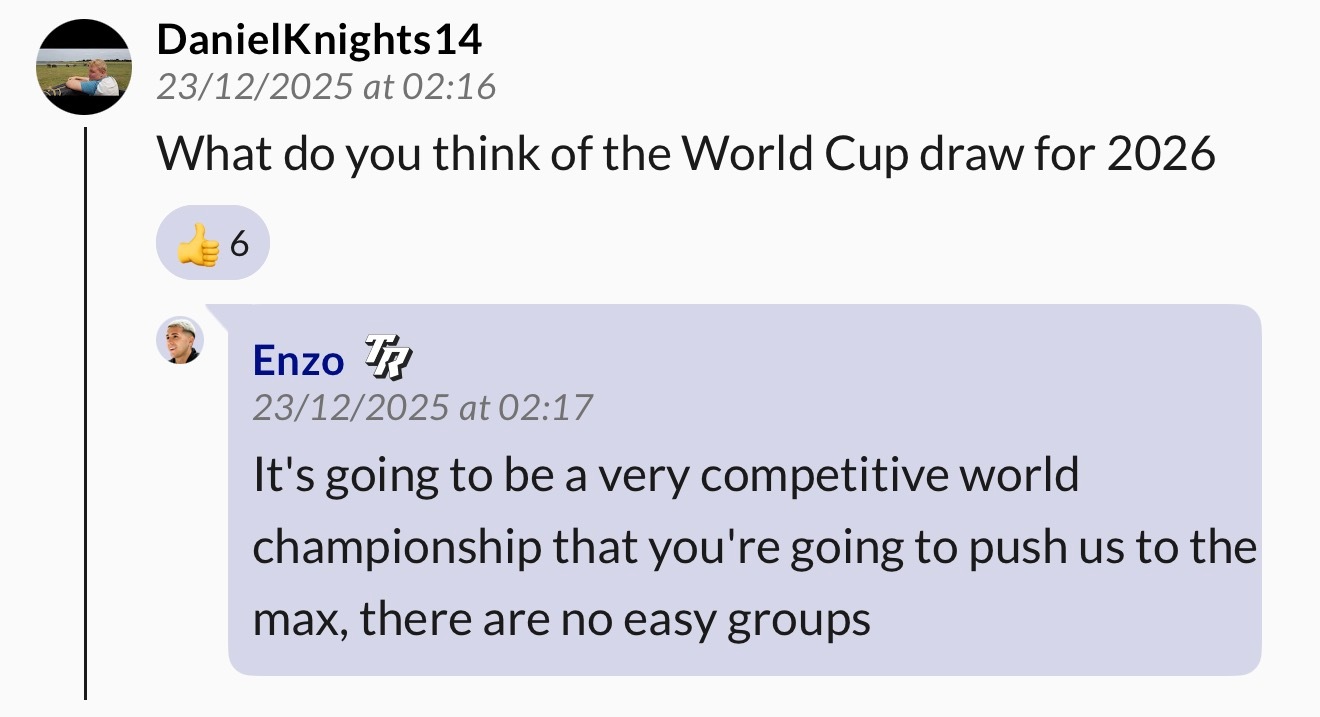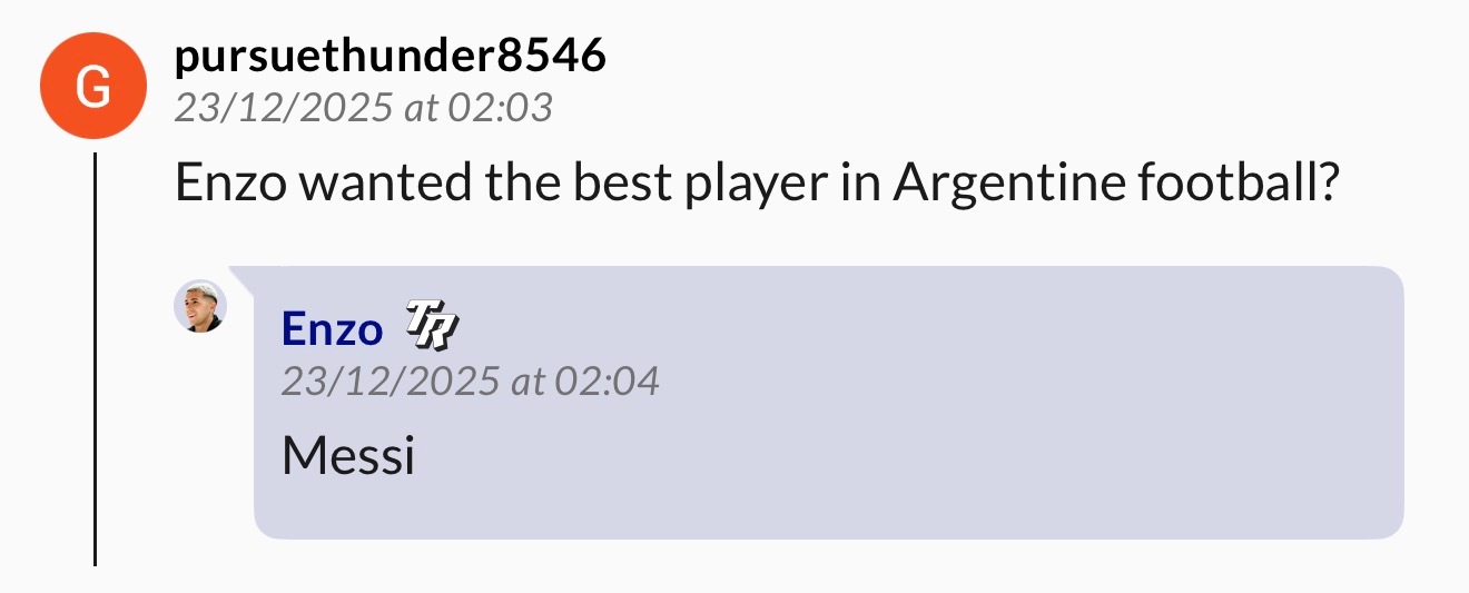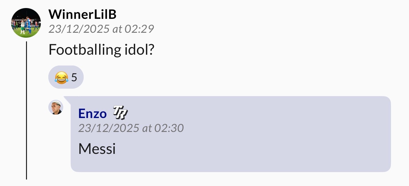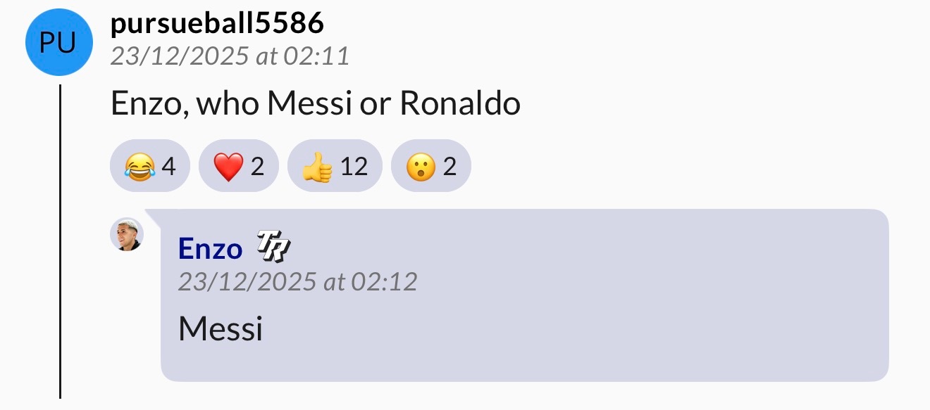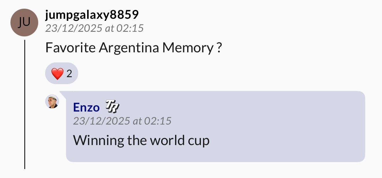 20251223 恩佐·费尔南德斯在The Residency与球迷的互动节选,对老梅是真爱——作为一名足球运动员,最美好的回忆是什么?恩佐:和Leo一起赢得世界杯。——恩佐你认为阿根廷足球最好的球员是谁?恩佐:梅西。——恩佐,梅西还是C罗?恩佐:梅西。——你的足球偶像是谁?恩佐:梅西。——最喜欢的阿根廷记忆?恩佐:赢得世界杯。——你如何看待2026年世界杯的分组抽签?恩佐:这将是一届竞争非常激烈的世界杯,会把我们逼到极限,没有轻松出线的小组。足坛历史第一人梅西阿根廷vs奥地利梅西回忆录