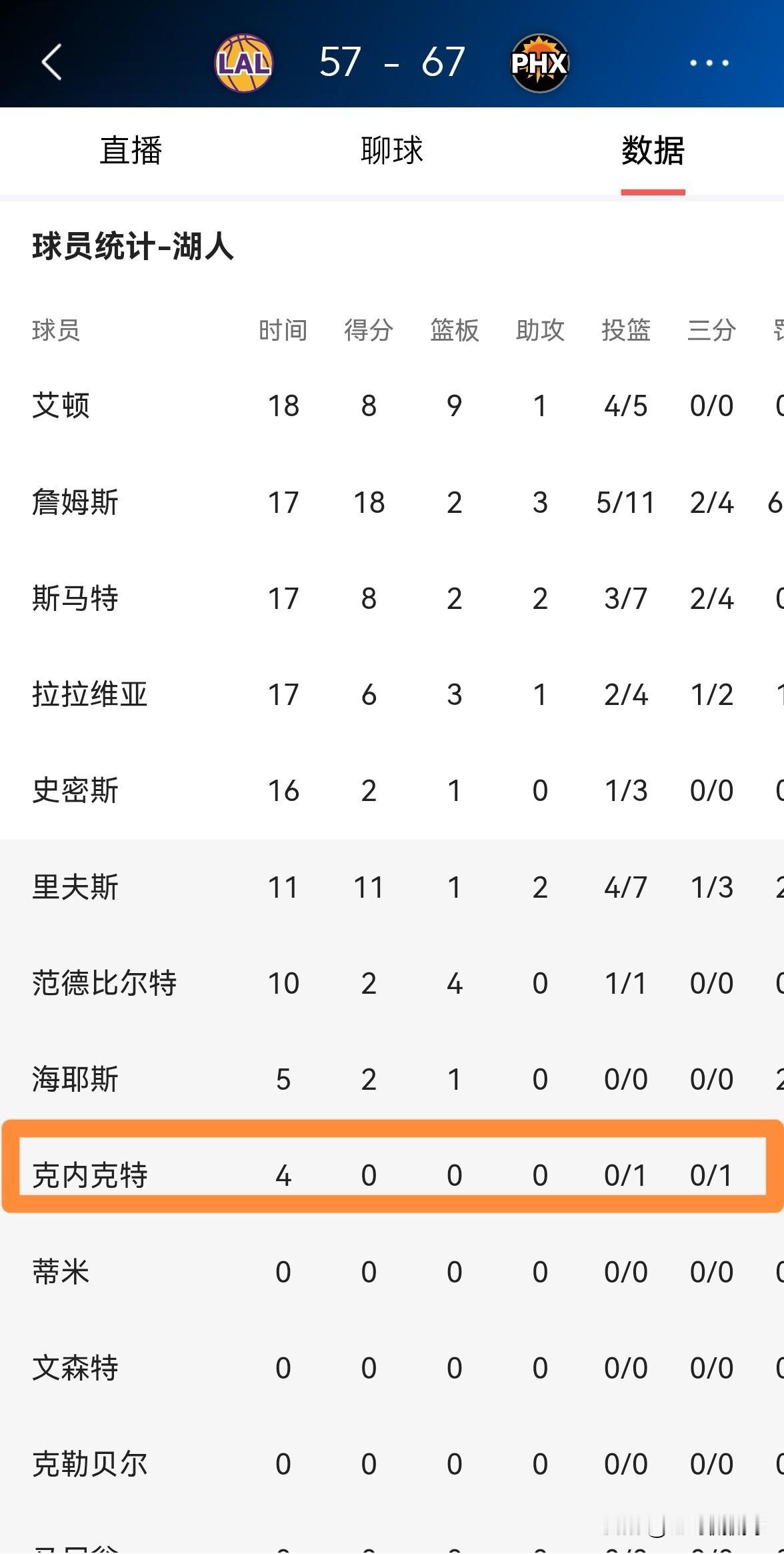 我强烈建议湖人立刻交易走克内克特,他真是毫无用处!在今天湖人客场挑战太阳的上半场比赛中,克内克特替补出战4分钟,投篮1中0怒砍0分0篮板0助攻0抢断,不过有1失误和1犯规,他的场上正负值为-7。 克内克特之所以在前两节比赛中仅仅得到4分钟的上场时间,主要原因在于他的防守太烂了,他完全防不住任何人。
