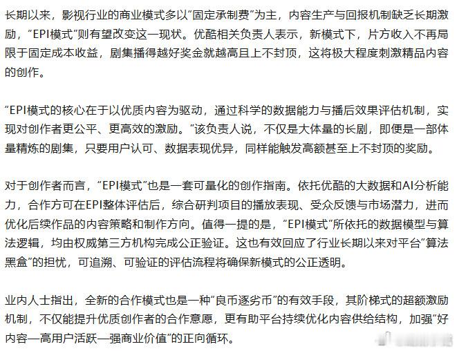 优酷宣布升级剧集合作模式,旗下剧集项目将逐步接入EPI评级体系,平台将根据剧集播出后的系统评分和实际效果为制片方发放激励奖金。EPI是优酷针对剧集内容的价值评估指标,与站内评级、播放热度,站内收入等相关