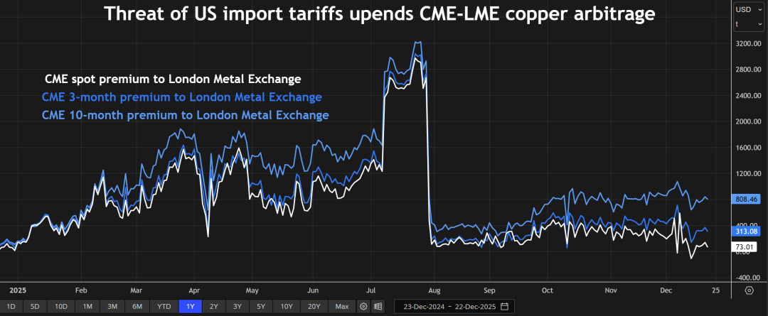 芝加哥商品交易所(CME)的美国铜期货合约价格走势更为强劲,其定价已计入精炼铜进口可能加征关税的预期。特朗普政府虽已将相关决议推迟至明年年中,但事实证明,关税威胁本身对市场造成的扰动,与关税落地的实际影响不相上下。