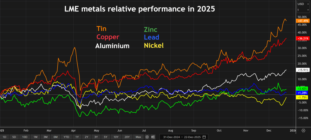 (2025年伦敦金属交易所各类金属相对表现)