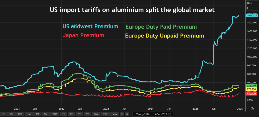 当前美国铝现货较伦敦金属交易所基准价的溢价达到每磅89美分(折合每吨1,967美元),创下历史新高。这一溢价水平甚至超过了拟议中50%的关税税率,表明美国市场正陷入铝供应短缺的困境。