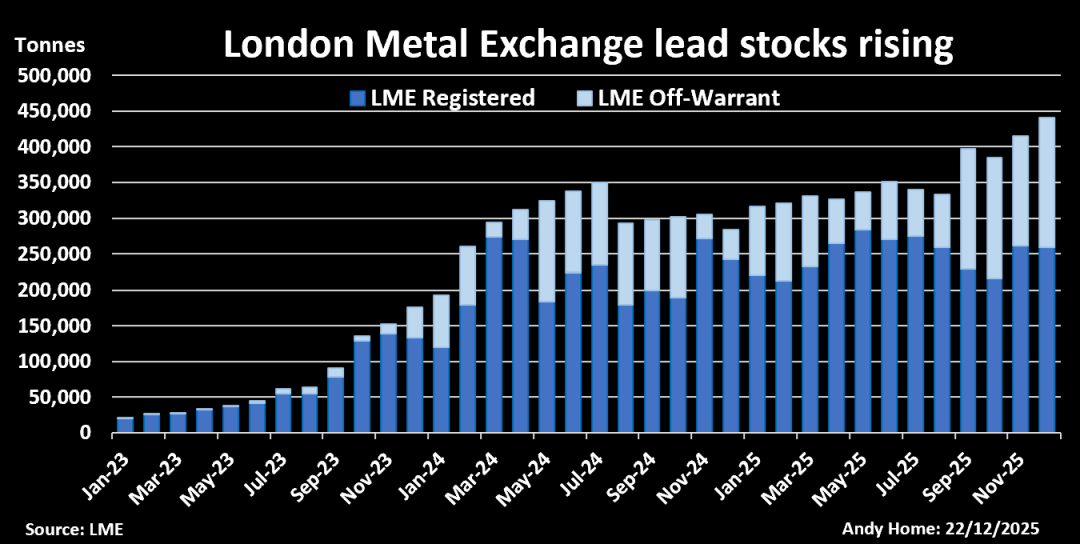 这种频繁的仓单流转掩盖了市场的真实信号:伦敦金属交易所铅注册库存与场外库存的总量正持续攀升,从2023年初的21,500吨增至如今的44万余吨。