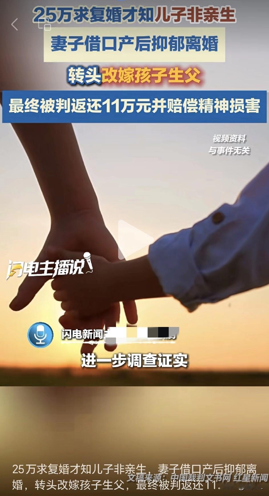 男子花25万求复婚,惊觉养大的儿子改姓了亲爹的姓!法院判了! 这年头,电视剧都不敢编的剧情,在现实里上演了。 山西孝义的穆先生,这两年过得那叫一个憋屈——2023年和妻子宋某离婚后,他心心念念想复婚,两年间陆续给前妻转了25万元,就盼着能破镜重圆。 可谁能想到,这镜子里照出来的,全是谎话。 时间倒回2023年4月,宋某以“产后抑郁”为由和穆先生协议离婚。同年11月,她终于承认:婚内出轨,孩子不是穆先生的。 但她紧接着又补了一句“良心话”:已和孩子生父断绝联系。 穆先生信了,还抱着复婚的希望,一笔笔钱转过去,前后整整25万。 直到2025年7月,一个细节让他彻底崩溃:儿子的社保卡,悄悄改了姓。 亲子鉴定一做,孩子果然非亲生。再一查,更扎心的真相浮出水面:宋某早在2023年11月——也就是她嘴上说“已断绝联系”的时候——已经和孩子的亲生父亲领证再婚了。 合着这两年,穆先生一边掏钱养别人的孩子,一边盼着和前妻复合,那边却早已一家三口团圆美满。 孝义法院近日作出判决: 宋某隐瞒重大事实,构成“不当得利”,判决返还穆先生11万元(扣除部分合理支出)。 同时,因其行为严重违背夫妻忠实义务,赔偿精神损失费1万元。 网友炸锅: “这剧情,编剧看了都摇头。” “25万就回来12万,这‘学费’有点贵。” “支持严惩婚姻欺诈,诚实是底线!” “女的出轨,儿子不是自己亲生的,支付了21万元,只给退11万,这到哪里说理去?” “应该全部返还➕精神损失费10万元!” “搞不懂,还得了14万。搞不懂,生父没钱赔?支持上诉!” “才赔偿1万,这种缺大德行为应该重判才对!” “25万只是离后求复婚给出来的,结婚时和离婚时肯定付出还要多。损失巨大!” 婚姻诚信是家庭的基石,隐瞒、欺诈不仅伤害感情,更可能人财两空。而法律,绝不保护恶意欺骗的一方。 一场“复婚梦”,到头来梦碎钱空。婚姻不易,且行且珍惜,但前提是——对方得是那个值得珍惜的人。 你对这个判决怎么看?评论区一起聊一聊! 信息来源于闪电新闻,侵联删!