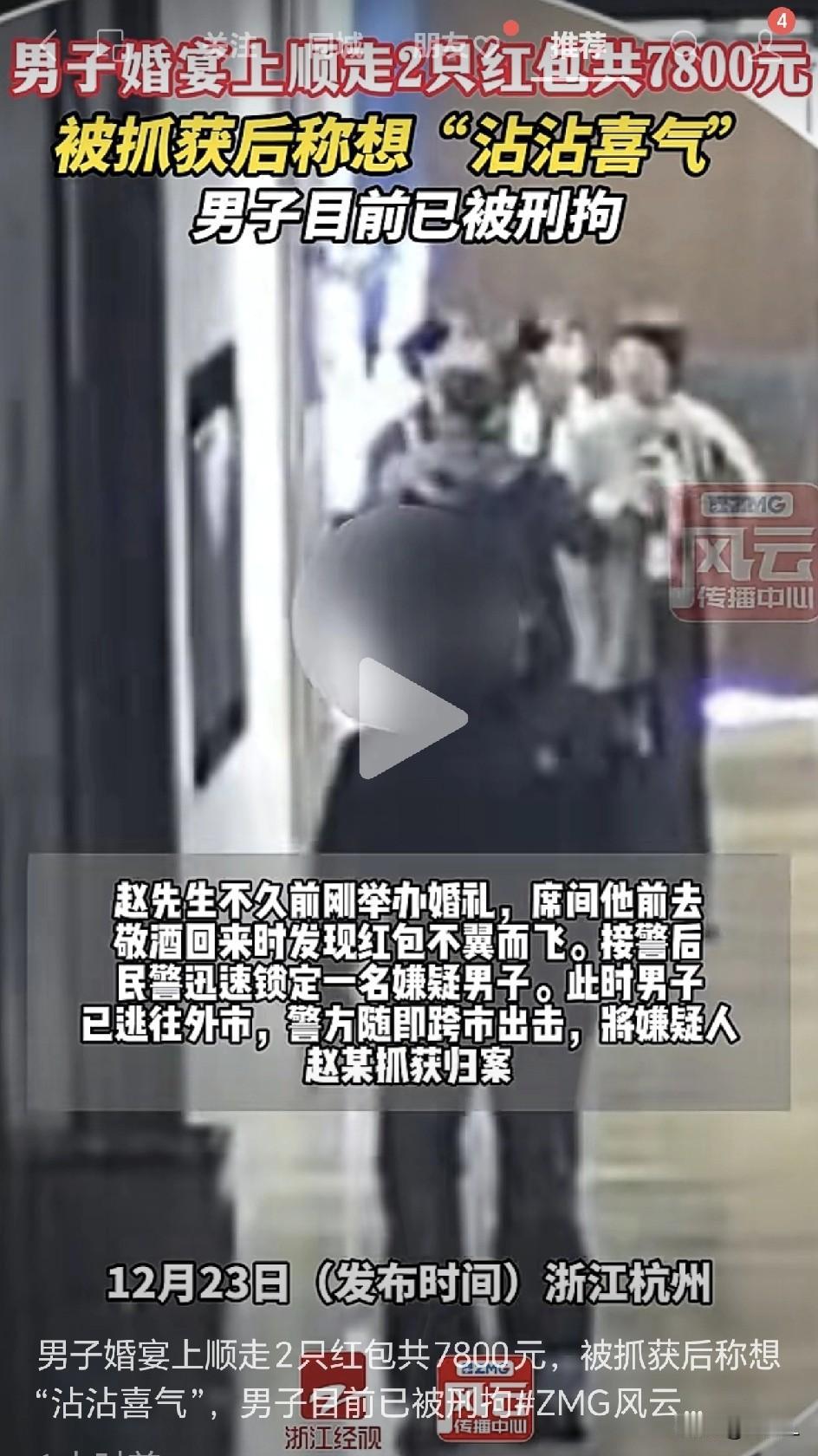 “沾喜气”变成偷红包!婚宴上顺手牵羊7800元,结果喜提手铐一副! 最近钱江世纪城派出所接到一位赵先生的报警,电话里那叫一个急:“警察同志,我刚结完婚,敬酒回来桌上的红包就不见了!” 原来,赵先生婚礼当天把收到的两个红包放在主桌上,就带着新娘子、伴郎伴娘去挨桌敬酒了。谁能想到,就这么一会儿功夫,红包竟“长腿跑了”! 视频一查,好家伙,“蹭喜气的”成了“偷喜气的” 派出所民警调取监控一看,发现一名陌生男子在婚宴现场转悠,眼睛往主桌一瞟,顺手就把红包塞进了自己口袋,随后溜之大吉。 此时,这人已经跑到了外地。但民警二话不说,跨市追击,在当地警方配合下,直接把这位“喜气小偷”赵某给按住了。 一问动机,简直让人哭笑不得! 赵某交代,自己本来是去酒店吃饭的,看到有人办婚宴,就想着进去“沾沾喜气”。结果喜气还没沾到,倒先看见了桌上两个孤零零的红包。 他一看四周没人注意,脑子一热,把红包“顺”走了,里头整整7800元现金。 这下好了,“喜气”没沾上,倒是“喜提”刑事拘留,接下来恐怕要在看守所里冷静冷静了。 网友神评: “这哪是沾喜气,这是晦气找上门。” “婚礼红包都敢偷,这是想给自己攒‘婚房首付’吗?” “新郎:我敬酒一圈,你把我红包循环了?” “他想沾沾牢饭的香味!” “现在还有手欠的人啊,家家户户,条条大路都是监控摄像头!” “在里面好好待着吧!伸手必被捉!” 结婚喜宴,喜庆归喜庆,安全不能忘!红包、首饰等贵重物品,一定要专门找人保管好,别让喜事变成闹心事。 目前,赵某已被依法刑拘,案件正在进一步办理。 最后提醒各位:君子爱财,取之有道,别人的喜事,可别变成自己的“刑事”啊! 信息来源于浙江经视,侵联删!