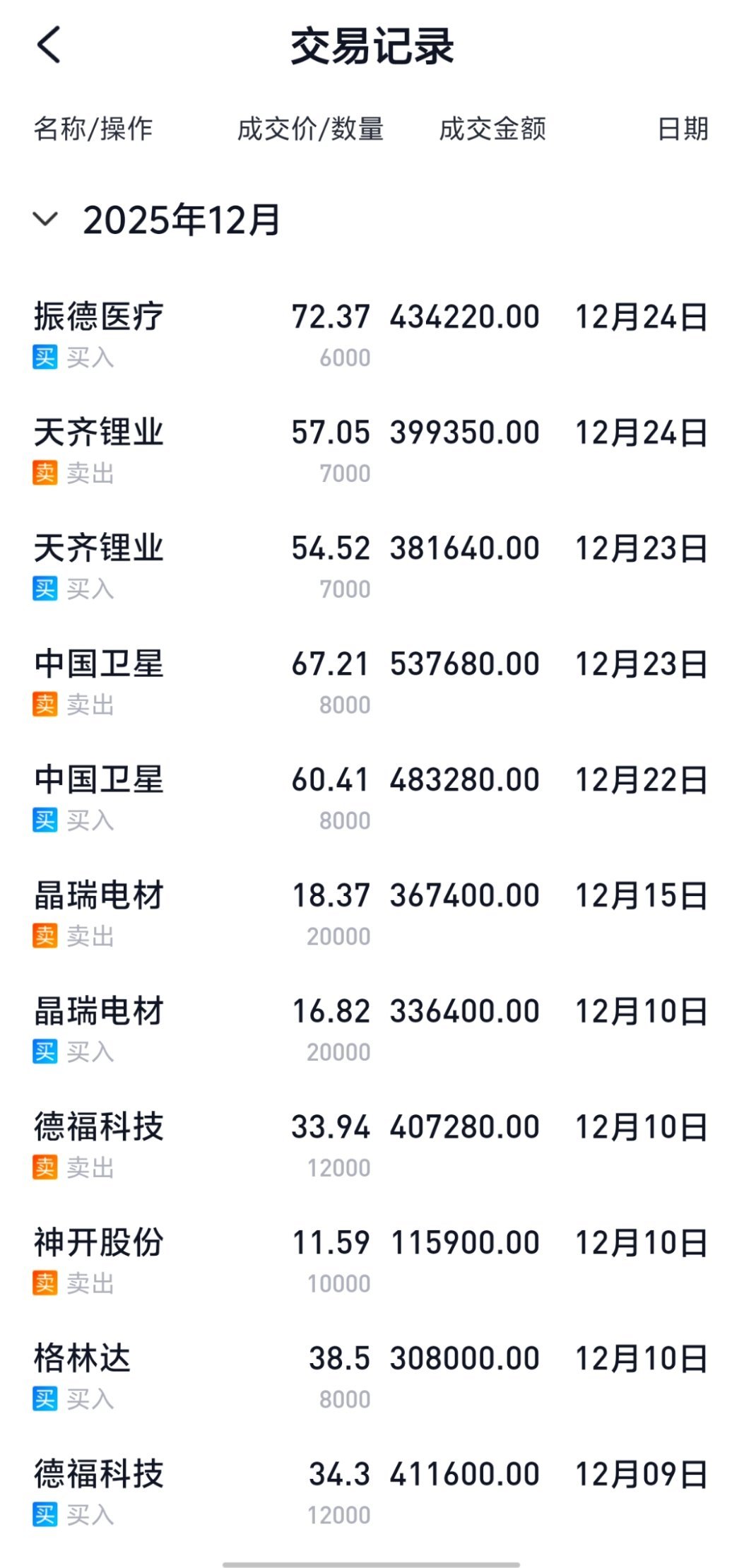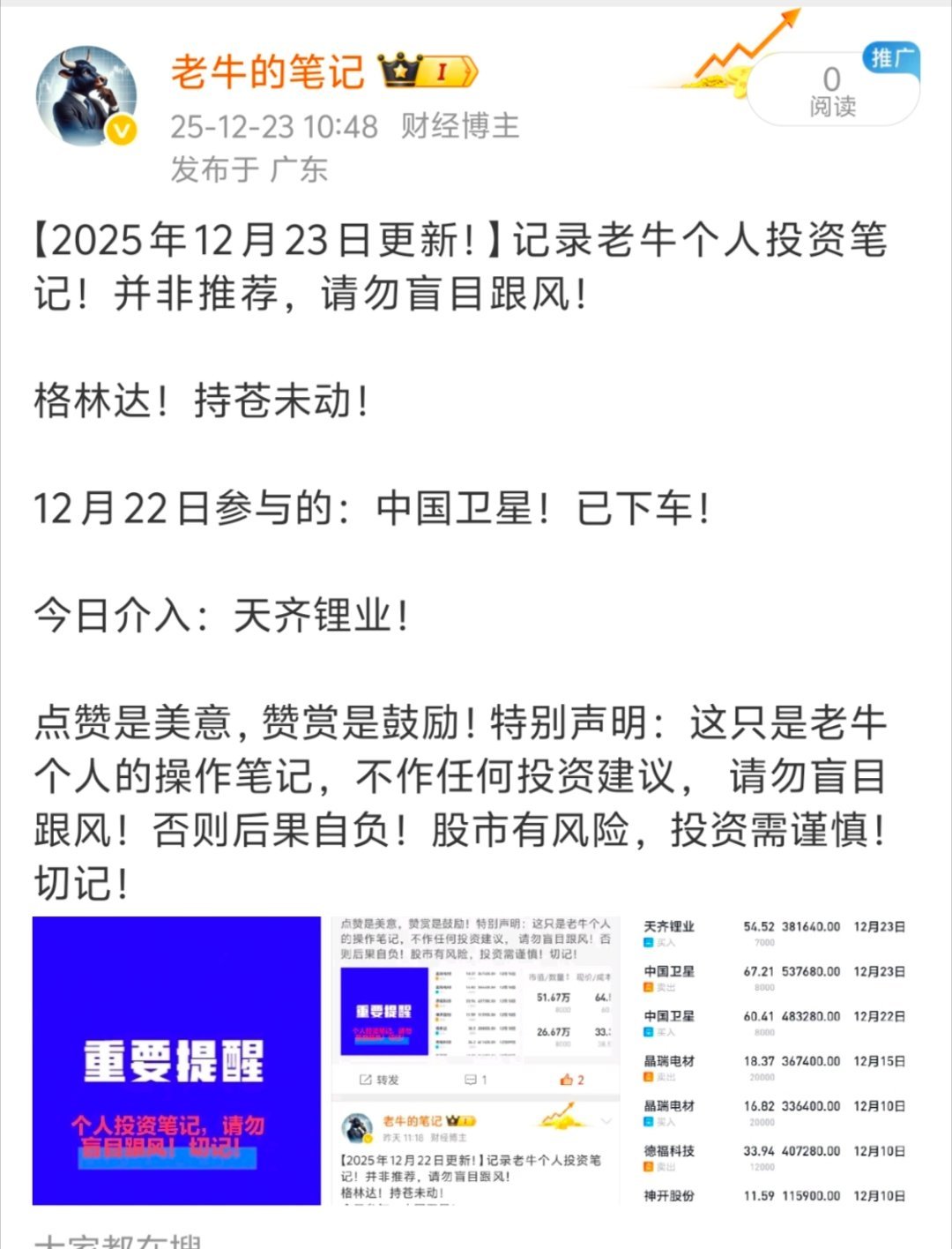 【2025年12月24日更新!】记录老牛个人投资笔记!并非推荐,请勿盲目跟风! 格林达!持苍未动!12月23日参与的:天齐锂业已下车!今日介入:振德医疗!点赞是美意,赞赏是鼓励!特别声明:这只是老牛个人的操作笔记,不作任何投资建议, 请勿盲目跟风!否则后果自负!股市有风险,投资需谨慎!切记!
