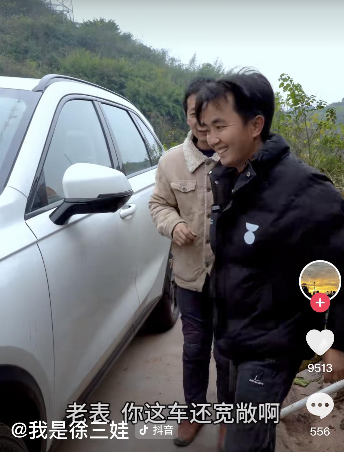 感觉厂家可以给徐三娃加鸡腿了!这新车才买几天,多次出镜,啥子车里看电视、宽敞又耙合,我都背得到了! 徐三娃西装革履去买新车,仪式感足足的,小开心说:车上看电视。老年人说,宽敞又耙合。 徐三娃卖香蕉,薛二毛帮到搬到后备箱,说还是表叔的车好,巨能装,性能好。 徐三娃帮三舅卖碰柑,摘了四背篼,放在尾箱,三舅还上去坐了坐,简直宽敞又耙合! 徐三娃接父母到丈母娘家做客,山路崎岖,坡道转弯,徐三娃开得很稳。表示:一下就开到场坝了。 今天,徐三娃去给丈母娘买水管等配件,众人称赞:老表的车宽敞。 是不是这样。