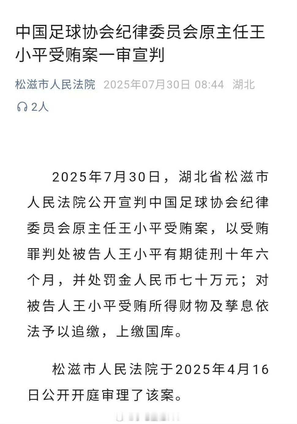 王小平受贿案二审宣判湖北荆州市中级人民法院官方:中国足球协会纪律委员会原主任王小平受贿案二审公开宣判,裁定驳回上诉,维持原判。 2025年7月30日,湖北松滋市人民法院官方:中国足协原纪律委员会主任王小平因受贿一审获刑十年六个月,并处罚金人民币七十万元。 据此前媒体报道,检方指控其涉案金额为645万元,不过,王小平自辩无罪,辩护律师也做了无罪辩护。据了解,王小平案争议巨大,其被移交检察院后即翻供,否认受贿。控辩双方对罪与非罪的分歧明显,故案件进展缓慢。王小平受贿案二审维持原判体坛风云