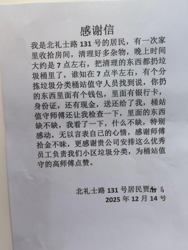 “里面东西一点不缺,我特别感动,心情难以言表,为拾金不昧的高师傅点赞!”12月15日,居民贾先生专程来到西城区展览路街道新华南社区,为保洁员高来富送上感谢信和锦旗,感谢他在分拣垃圾时凭借耐心和细致,及时发现了自己遗失的贵重物品,并送还到自己手中。