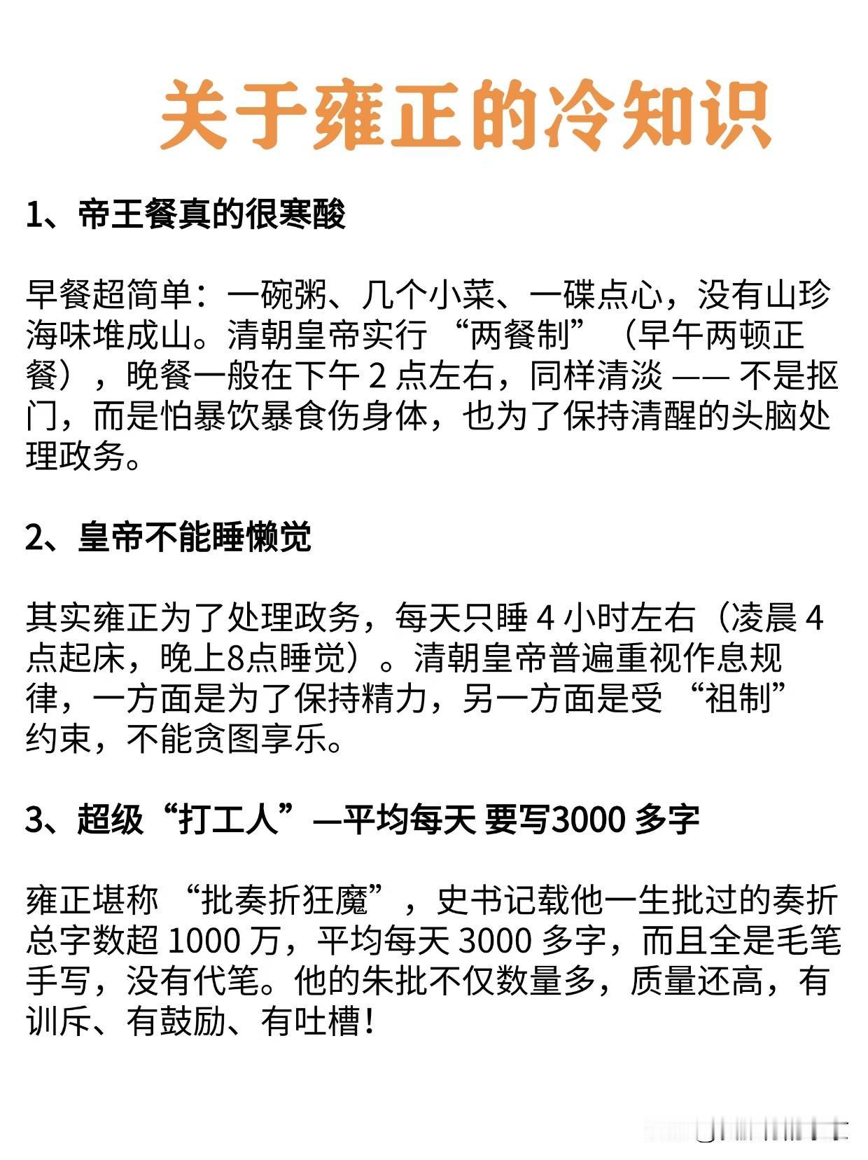 如果你用雍正皇帝的作息过一天... 雍正才是顶级的牛马!! 真的累够呛(*꒦ິ⌓꒦ີ) 每天~ 早上4.00点🕓就得起床, 5.00点到7.00点🕖上早朝,听大臣们的工作汇报。 8.00点🕗吃早饭,只有清粥小菜和点心, 8.00点半🕣,去给太后请安, 9.00点🕘,开始读书, 9.00点半🕤到12.00点,批奏折,召见大臣,发谕旨,安排工作, 13.00点🕒吃晚饭, 14.00-15.00🕗点睡午觉, 15.00-18.00🕗自由活动时间, 18.00🕗吃宵夜, 19.00🕗礼佛,书经, 20.00🕗洗漱准备睡觉, 如果当天翻牌子,就“促膝谈心然后睡觉,如果不翻牌子就直接睡觉”。 雍正没有休过节假日,一天只睡四五个小时,他后宫有28个妃子,但子女才有14个,能看出来他得有多忙! 这样的皇帝,这样的作息时间,让你当皇帝,你还愿意吗?