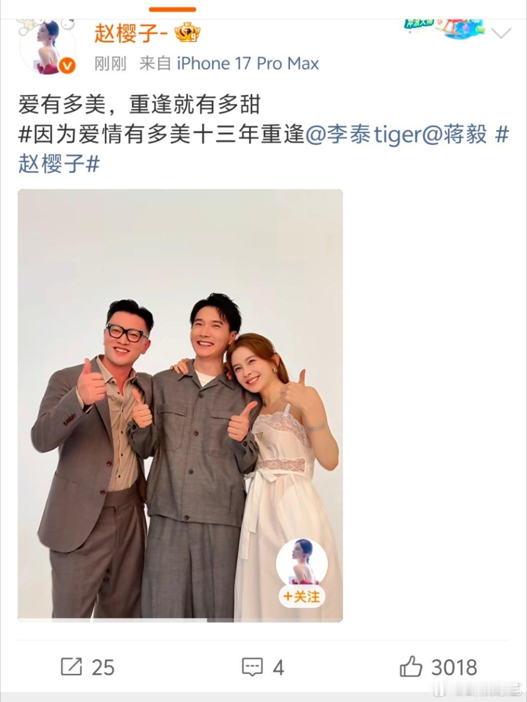 赵樱子和蒋毅李泰合拍视频谁的青春被击中了!赵樱子、蒋毅、李泰《因为爱情有多美》十三年后惊喜合体,vlog里一笑瞬间梦回追剧的夏天!回不去的何止是时间,还有我满满的青春记忆啊。赵樱子因为爱情有多美十三年重逢赵樱子晒因为爱情有多美重逢vlog