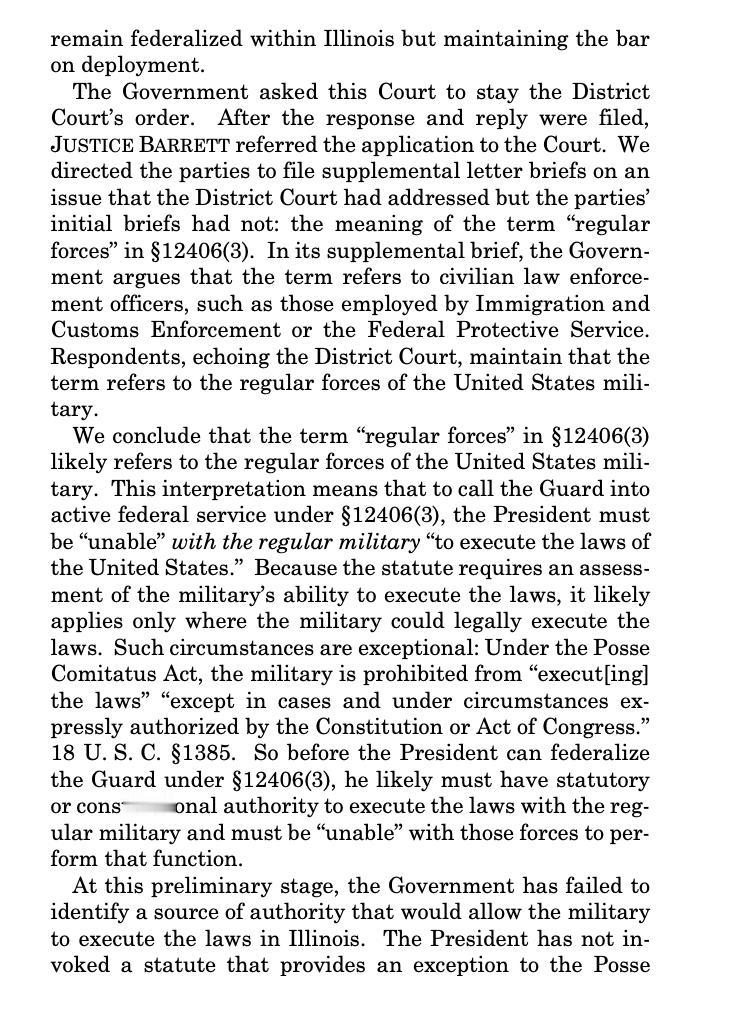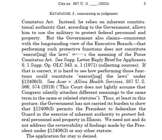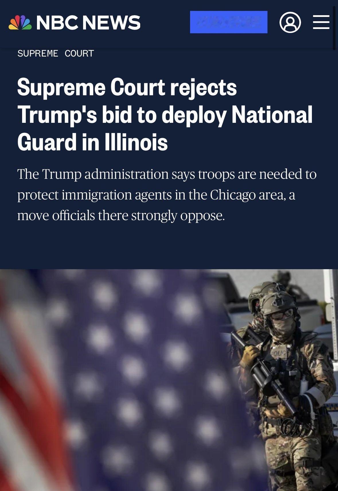 美国最高法院以 6 比 3 的投票结果,阻止了特朗普总统向伊利诺伊州部署国民警卫队,驳回了政府提出的暂缓执行申请。 三名右派大法官与三名温和派大法官联合投了反对票,阿利托Alito大法官持反对意见,托马斯Thomas大法官附议。戈萨奇Gorsuch大法官持反对意见。卡瓦诺大法官表示同意。