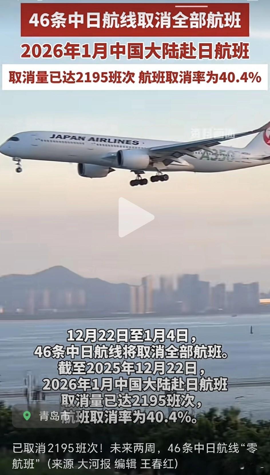 紧急避雷!接下来两周赴日航班46条线路全部取消!2026年1月赴日航班取消率目前已确认的高达40%,春节想去日本的懵了! 最近想飞日本的朋友,先别急着掏钱包——你订的航班,说不定已经“凭空蒸发”了! 最新数据显示,未来两周,整整46条中日航线被“团灭”,全部航班取消,波及中国26城和日本18个机场。取消率100%,简直是航线界的“集体失踪案”! 更扎心的是,明年1月大陆赴日航班已取消近2200班,每10班就有4班飞不了。航司早就“预警”:明年3月28日前日本机票可免费退改,这哪是福利,分明是“快跑”信号啊! 机票暴涨,酒店跳水,冰火两重天! 上海-大阪不含税票价,从11月的“白菜价”100元猛蹿到500元,翻得比煎饼还快。 而日本那边,大阪、京都酒店老板已哭晕:中国游客锐减,价格暴跌,营业额直接腰斩30%-40%……有民宿老板哀叹:“准备好的中文标语,现在只能对着空房间念了。” 眼看日本线凉凉,航空公司连夜把飞机往东南亚、澳大利亚调。泰国瞬间杀回寒假出境游C位,看来大家的旅行预算,终究是泼到了曼谷的泳池里。 时间线捋一捋: 👊11月15日:航司突然开放日本机票免费退改,旅客开始“大撤退”。 👊12月22日:数据爆出航班大规模取消,网友:“我的东京跨年梦,还没起飞就坠机了。” 👊12月23日:运力疯狂转向,“泰国免签”或成最大赢家。 👊明年1月:中日航线预计再砍28%,关西机场等“靠中国游客吃饭”的地方,怕是要喝一阵子北风了。 友情提示: 已经订了日本行程的,赶紧查航班、联系退票!还没订的,不妨换个目的地——毕竟,你的假期很贵,别浪费在“等不来的飞机”上。 再说,这个时候还要上杆子去给小日子送钱,对得起你护照上的国籍吗? 国家大义面前,普通人做不了什么惊天动地的事情,但是控制自己踏出国门的脚步应该还有这个自控力吧? 这个时候不给国家添堵,就是普通人的爱国! (悄悄问:今年春节,你准备改道去哪儿?评论区晒晒备用方案!) 信息来源于半岛都市报,侵联删!