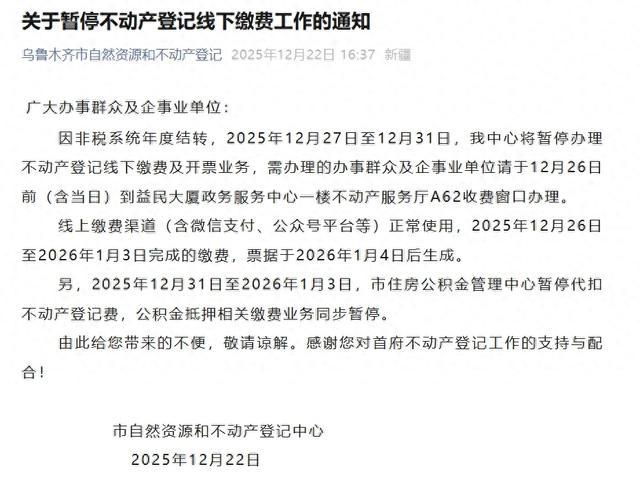 据“乌鲁木齐市自然资源和不动产登记”微信服务号消息,乌鲁木齐市自然资源和不动产登记中心于12月22日发布《关于暂停不动产登记线下缴费工作的通知》,因非税系统年度结转,2025年12月27日至12月31日,该中心将暂停办理不动产登记线下缴费及开票业务,需办理的办事群众及企事业单位请于12月26日前(含当日)到益民大厦政务服务中心一楼不动产服务厅A62收费窗口办理。