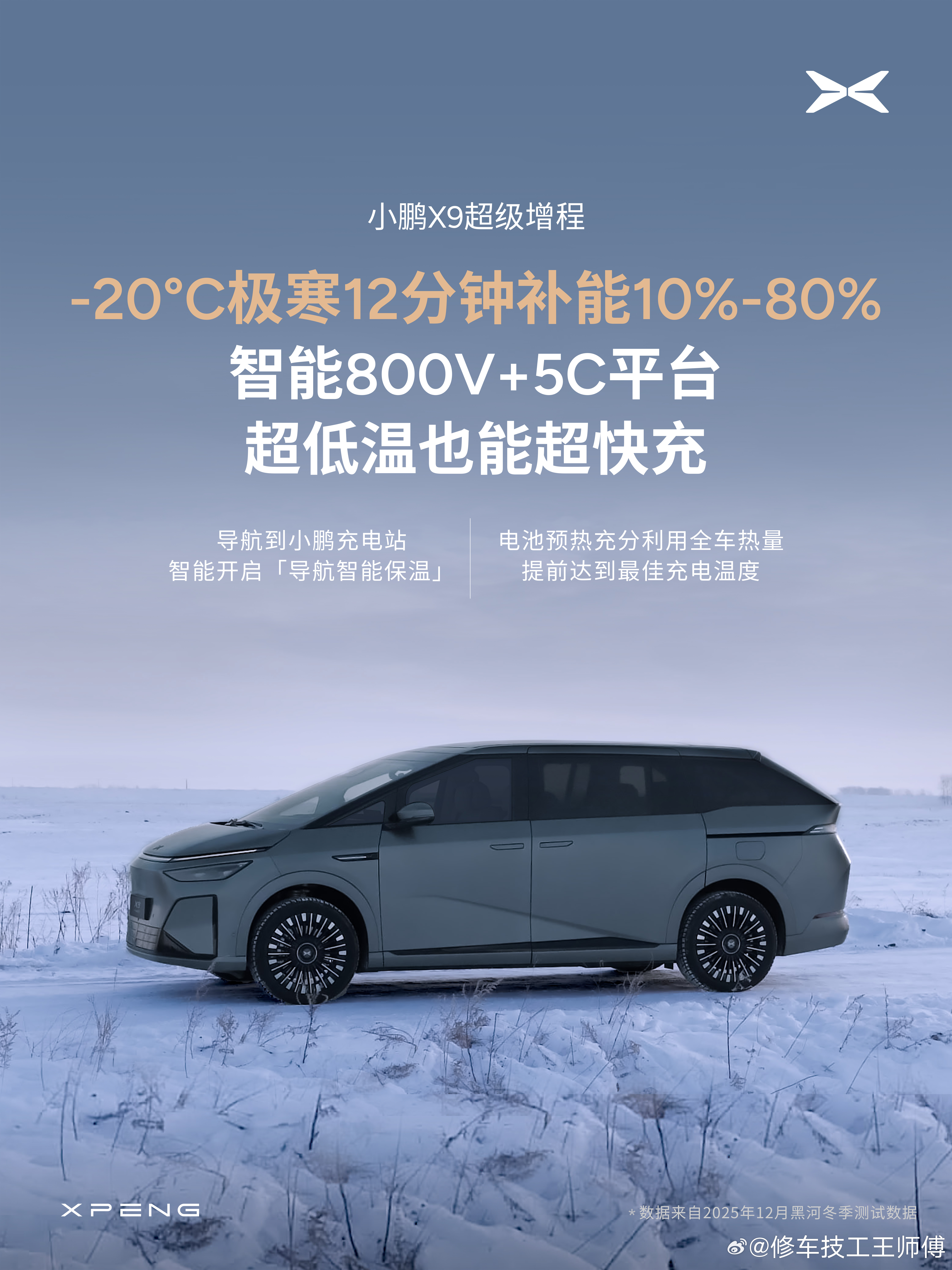 每年的冬季,不少车企都会做冰雪试驾,其实这种严寒天气对新能源车是非常大的考验。尤其是三电和热管理系统,如果这两项搞不好,别说冰雪试驾了,续航直接拉胯,车内暖风跟不上,驾乘人员遭老罪了。近期,小鹏带着X9增程版到东北进行了冰雪试驾,这款车的表现获得了很多媒体的认可,究其原因还是小鹏用技术实力说明了一切。首先就是三电,这款车把800V碳化硅平台+5C电池与增程系统结合,SOC 10%-80% 仅12分钟,这个几乎和20度左右的气温表现没什么差别。同时,11源热泵管理系统,让制热能力提升20%,-15度到21度,升温36度用时10分钟。有一说一,冬季的东北是检验新能源车的最佳场地,小鹏的三电和热管理有点东西。何小鹏冰雪试驾X9超级增程直呼太稳了