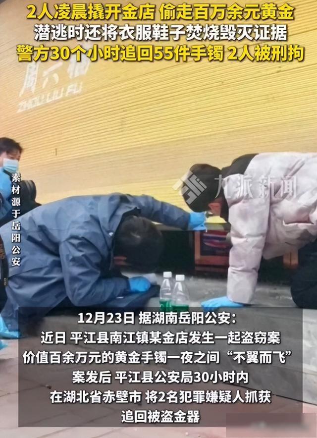 12月23日,九派新闻从岳阳公安获悉:12月20日凌晨,平江县南江镇一家金店被暴力撬开转闸门和玻璃门,店内大量黄金手镯被盗。经连夜工作,多处走访调查,细致现场勘查,警方迅速排查出两名男子有重大作案嫌疑。民警发现两名嫌疑人反侦查意识极强,作案前后多次换装、更换交通工具,甚至将作案交通工具、衣物、鞋子一并焚烧,毁灭证据,企图逃避打击。通过精准分析和区域协作,锁定为流窜作案的湖北籍人员谢某、金某,已逃往湖北方向。