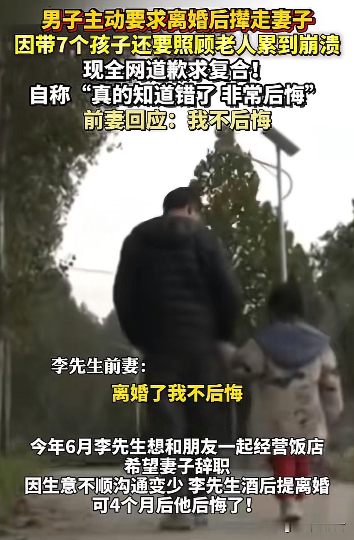 生七个孩子还主动提离婚的大哥现在后悔了、哈哈哈哈找来记者喊话给前妻道歉,说自己错了不该怀疑她出轨逼她净身出户。现在七个孩子外加两个身体不好的老人都需要照顾他实在是受不了了,希望前妻能回来复婚 我是真佩服这大哥的勇气,结婚15年给生了七个孩子还要伺候他父母,然后故意说老婆出轨及其顺利又快速的把婚给离了,现在又后悔说只要她肯回来继续过日子一定把酒戒了保证再也不打她了,希望通过镜头向前妻道歉能回来复婚7个孩子没有妈妈照顾很可怜,两个老人也想儿媳妇了 谁知道前妻说了一句你后悔我可不后悔,复婚不可能以后各自安好谁也别打扰谁[捂脸] 不过我觉得最终这前妻回去复婚的可能性很大,现在可能是气头上说不复婚不后悔但是一个能听话的生七个孩子的女人大概率也会因为七个孩子再回家 这大哥都找媒体全网道歉了又保证以后再也不喝酒不打人了诚意都在这了给了台阶说不定就下了 大家觉得这前妻还会回去吗?
