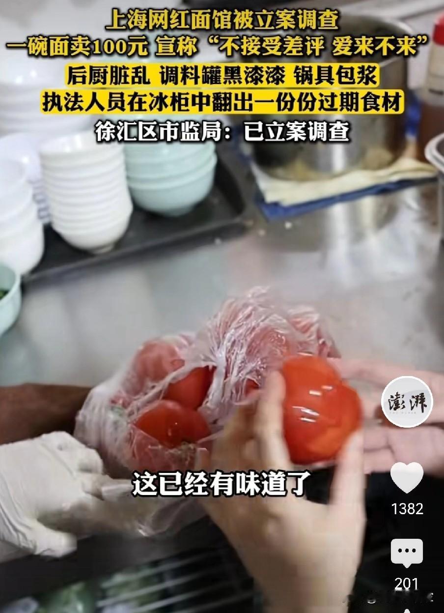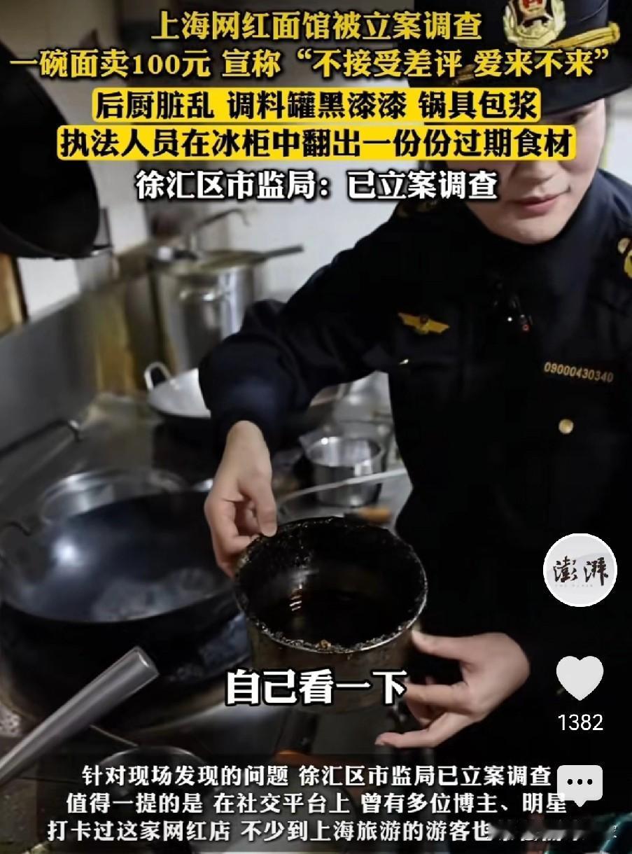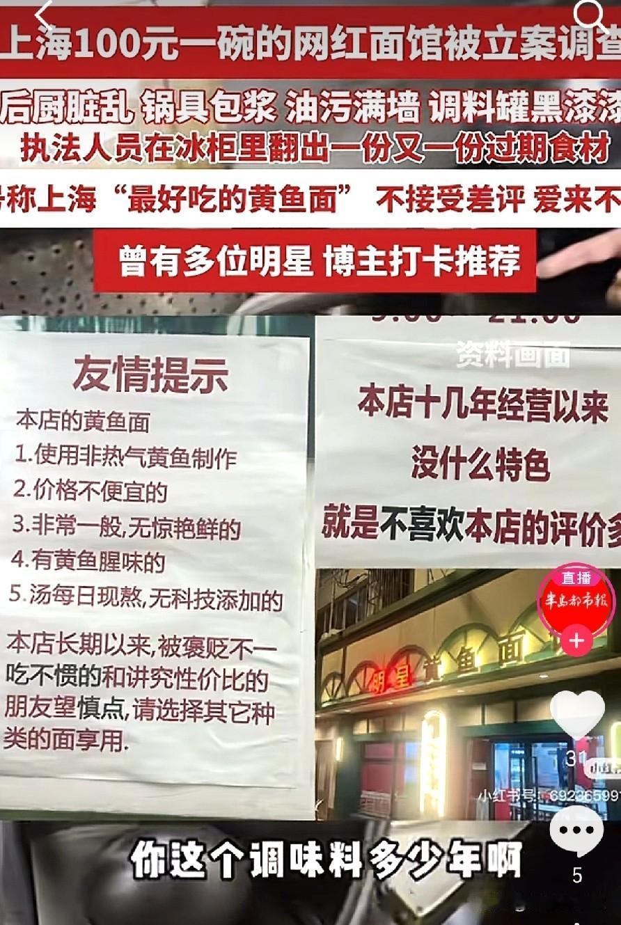 一碗面100块,号称上海最好吃的“黄鱼面”,这家“网红面馆”近日被立案调查了,执法人员来到后台,那脏乱程度,只能用“啧啧啧”来形容了。 这家宣称“不接受差评,爱来不来”的网红面馆,还被各地的网红博主,演员明星,甚至不少慕名的游客纷纷打卡探店过。 可谁能想到,光鲜的门头背后,后厨竟是另一番景象。面对脏兮兮,油滋滋,黑漆漆的后厨,服务员还在据理力争,“我每天都打扫了的”,再拿出一份份过期的食材,番茄,香干,豆腐都已经不新鲜了,老板还来一句,那是员工吃的。 很难想象这家被营销成了“网红店”,以前觉得贵点但至少老板的傲气,应该是卫生安全都达标了,谁能想到,价格高不等于优质食材啊,这不妥妥的“网黑”才对。 目前,这家面馆已经被立案调查。这下好了,网红滤镜碎了一地,也给那些靠着噱头博眼球、却不顾食品安全的商家,狠狠上了一课! (图片来自网络视频)
