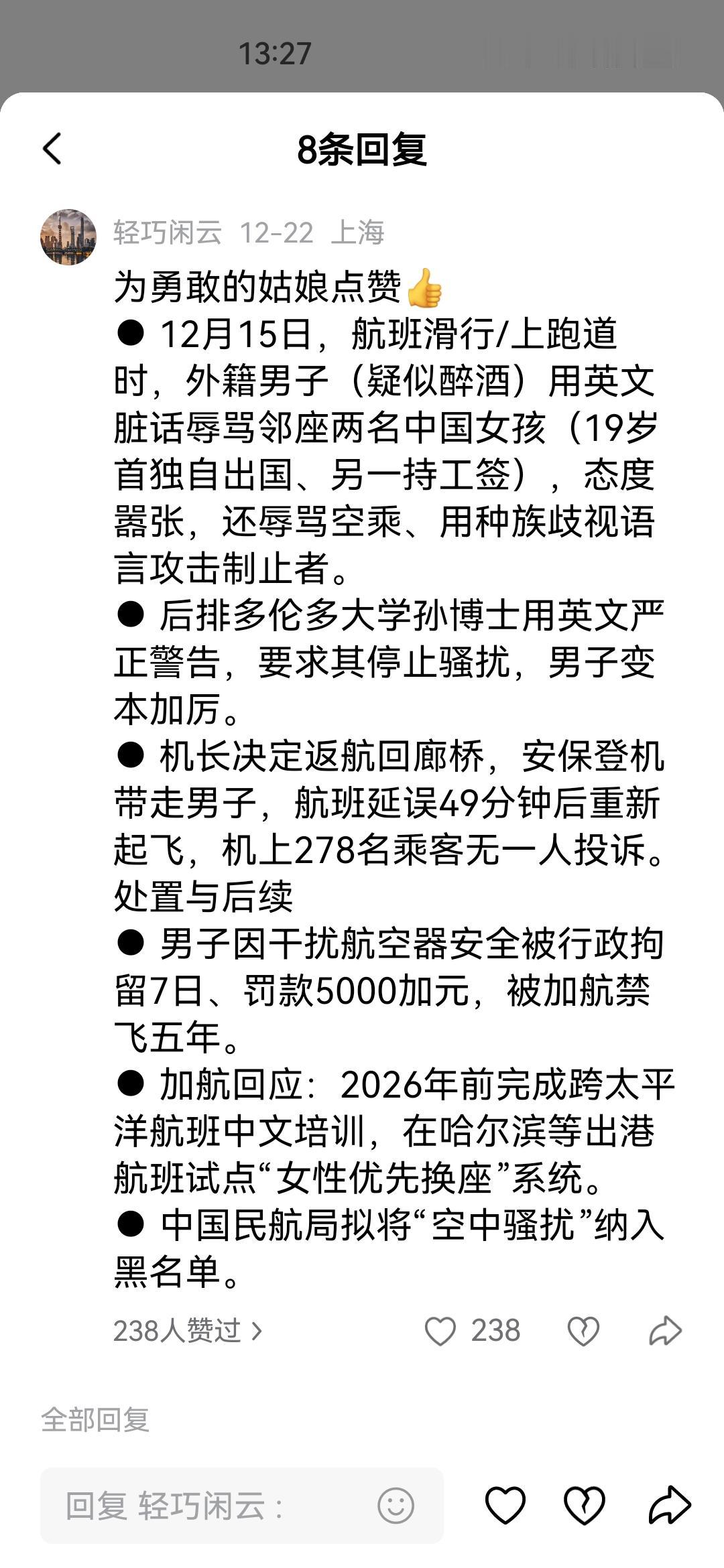 为勇敢的姑娘点赞👍 ● 12月15日,航班滑行/上跑道时,外籍男子(疑似醉酒)用英文脏话辱骂邻座两名中国女孩(19岁首独自出国、另一持工签),态度嚣张,还辱骂空乘、用种族歧视语言攻击制止者。 ● 后排多伦多大学孙博士用英文严正警告,要求其停止骚扰,男子变本加厉。 ● 机长决定返航回廊桥,安保登机带走男子,航班延误49分钟后重新起飞,机上278名乘客无一人投诉。 处置与后续 ● 男子因干扰航空器安全被行政拘留7日、罚款5000加元,被加航禁飞五年。 ● 加航回应:2026年前完成跨太平洋航班中文培训,在哈尔滨等出港航班试点“女性优先换座”系统。 ● 中国民航局拟将“空中骚扰”纳入黑名单。 最讨厌毫无素养的白皮猪!白垃圾! 当然了也讨厌有的中国人的垃圾行为! 这里没有种族歧视。 感谢孙博士为两个女孩子发声。 非常支持会英语的年轻人,对不文明的垃圾行为怼回去。 因为我们不会英语,有时候遇到隐性歧视就很窝火。没法还击,因为是隐性歧视,你还没法说。 如果是明显的歧视,我跟老伴儿说好了。如果遇到故意找事儿的明显歧视,咱们不管对的听懂听不懂,咱用汉语骂他。 反正也是情绪宣泄,骂了他解气就行,他说的咱也听不懂不是。