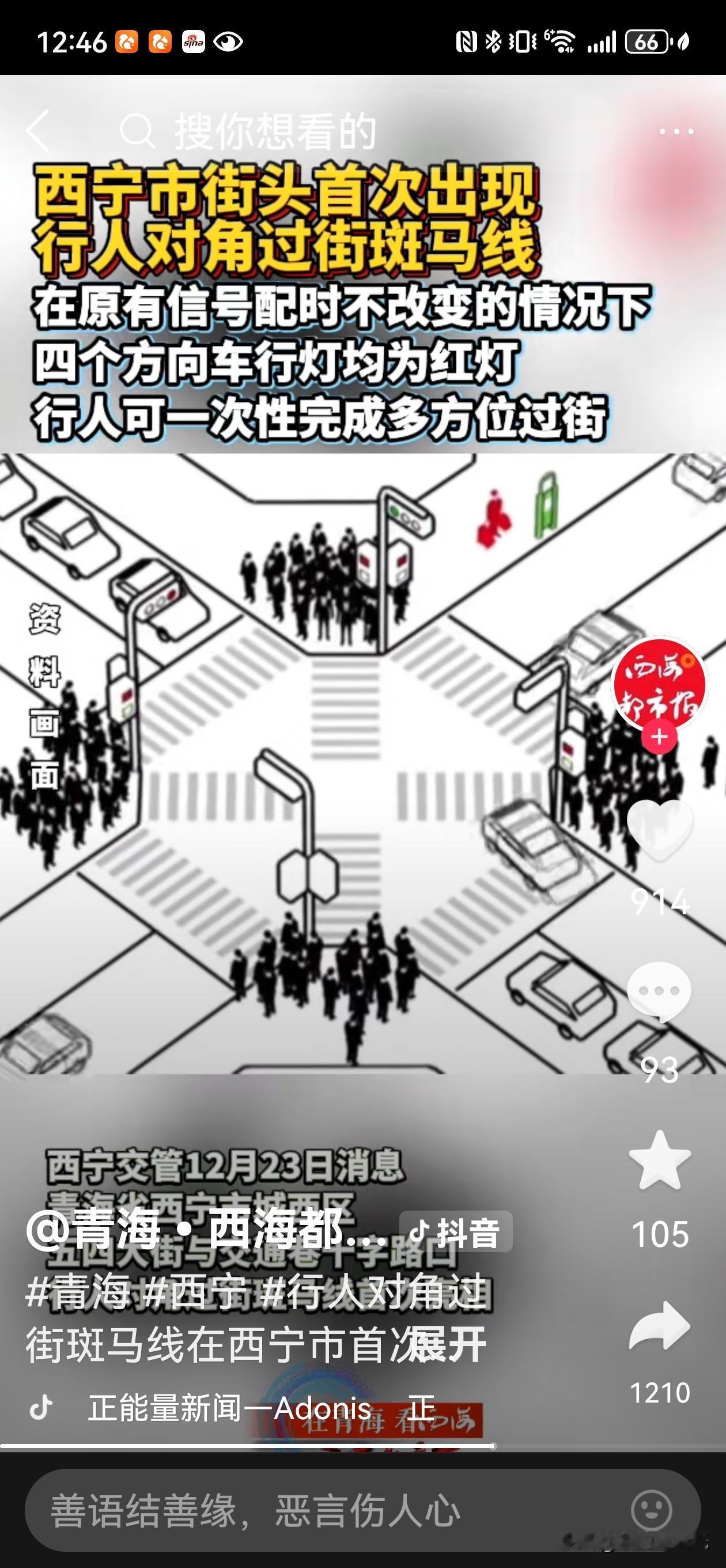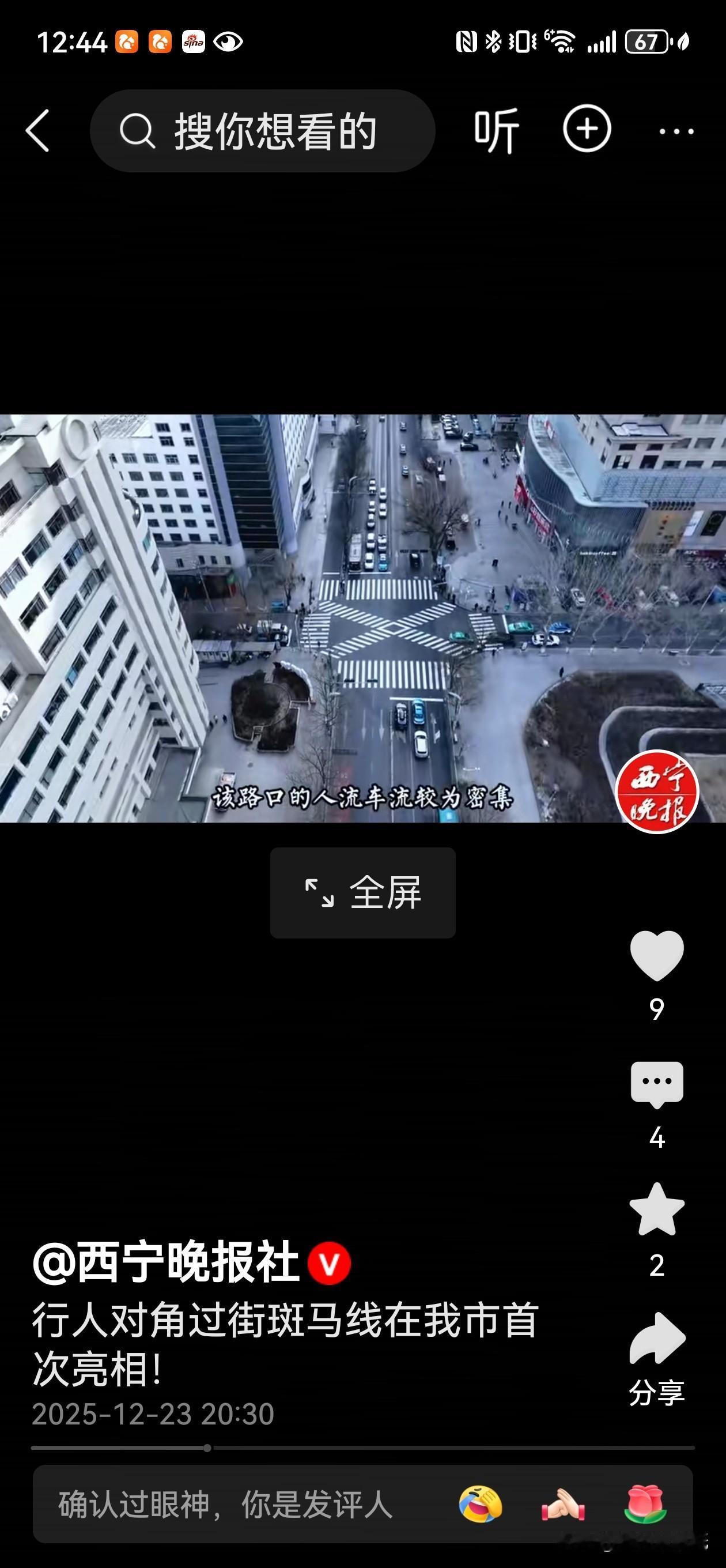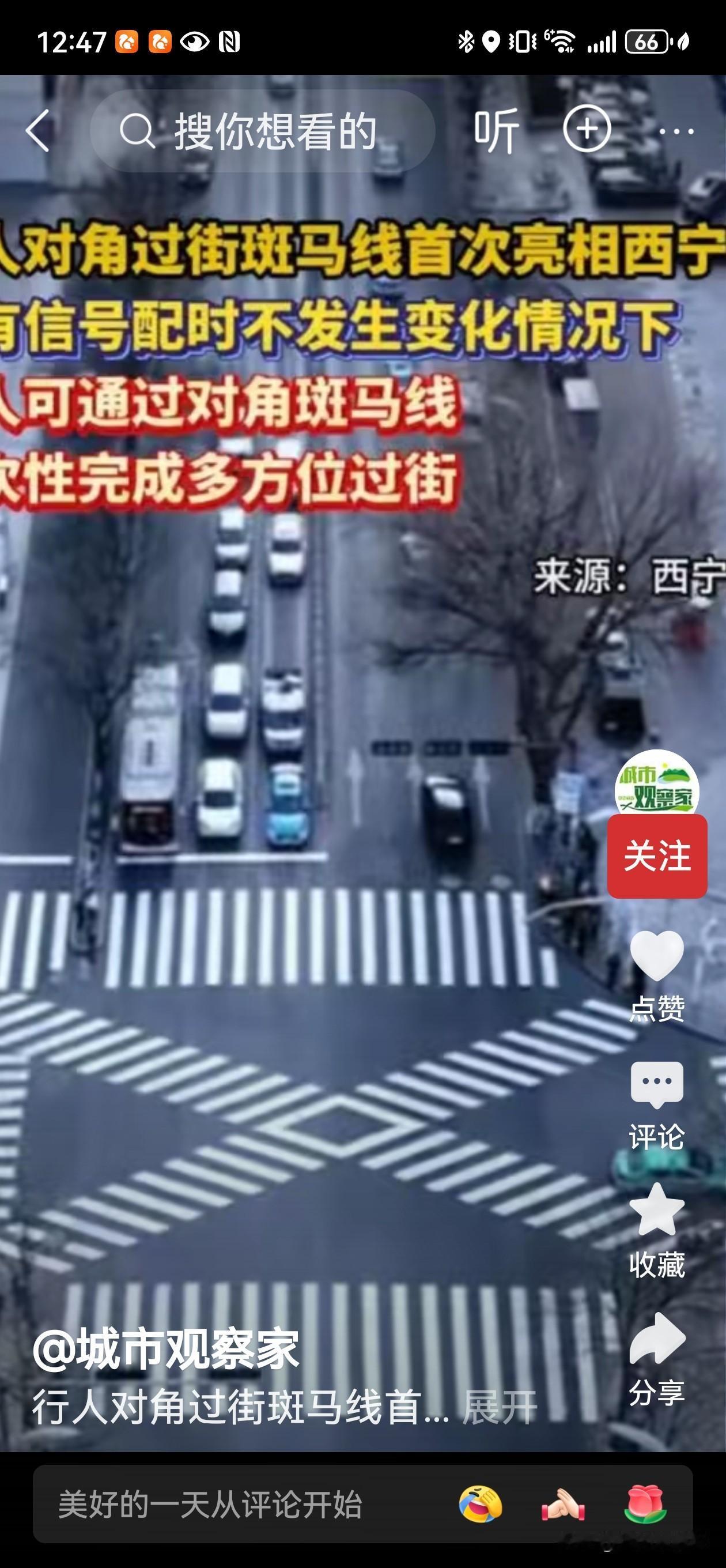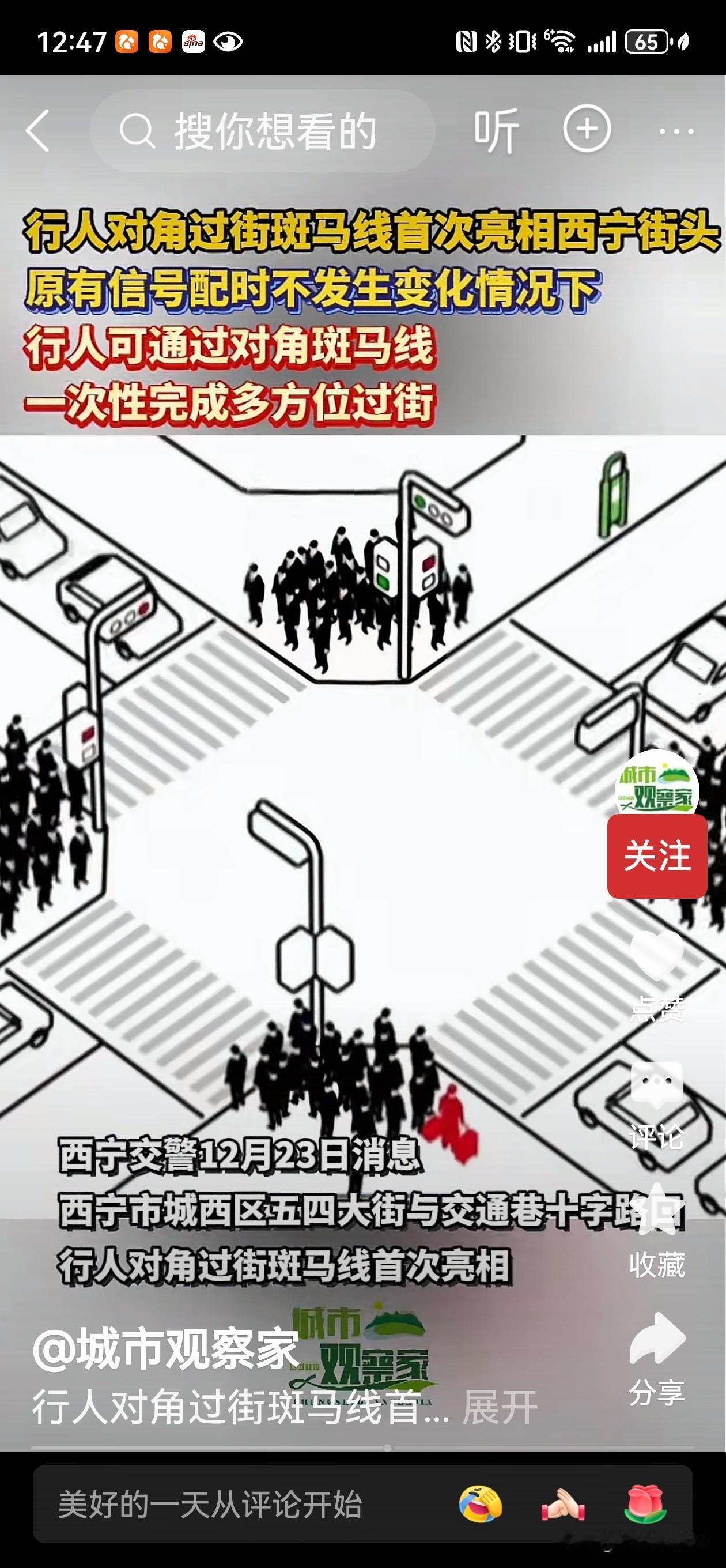 西宁街头惊现“斜着走”斑马线! 交警说,这是西宁首次启动的行人对角过街斑马线! 12月23日,西宁市城西区五四大街与交通巷十字路口“上新”了一种新奇斑马线——对角过街斑马线!它打破了多年来“直角转弯”式过马路的传统,行人现在可以沿着路口斜线,一口气直达斜对面! 它的妙处在于:在原有红绿灯时长不变的情况下,专门设置“全红时段”,四个方向车辆全部暂停,行人可自由选择直线或斜线一次性通过。这不仅将过街时间缩短近半,减少了二次等待,也大大降低了人车交织的风险,安全又高效。 这一人性化改造,尤其适合人流密集的大型路口,让通行变得简单从容。上线当天,就收获市民一片点赞:“方便多了!”“希望全市推广!” 智慧交通,就体现在这般贴心细节上。一次小小的“斜线”创新,折射出城市治理的进步与温度。期待这样的便利,能出现在更多街口,让每个人的出行都更顺畅、更安全! 交叉式斑马线