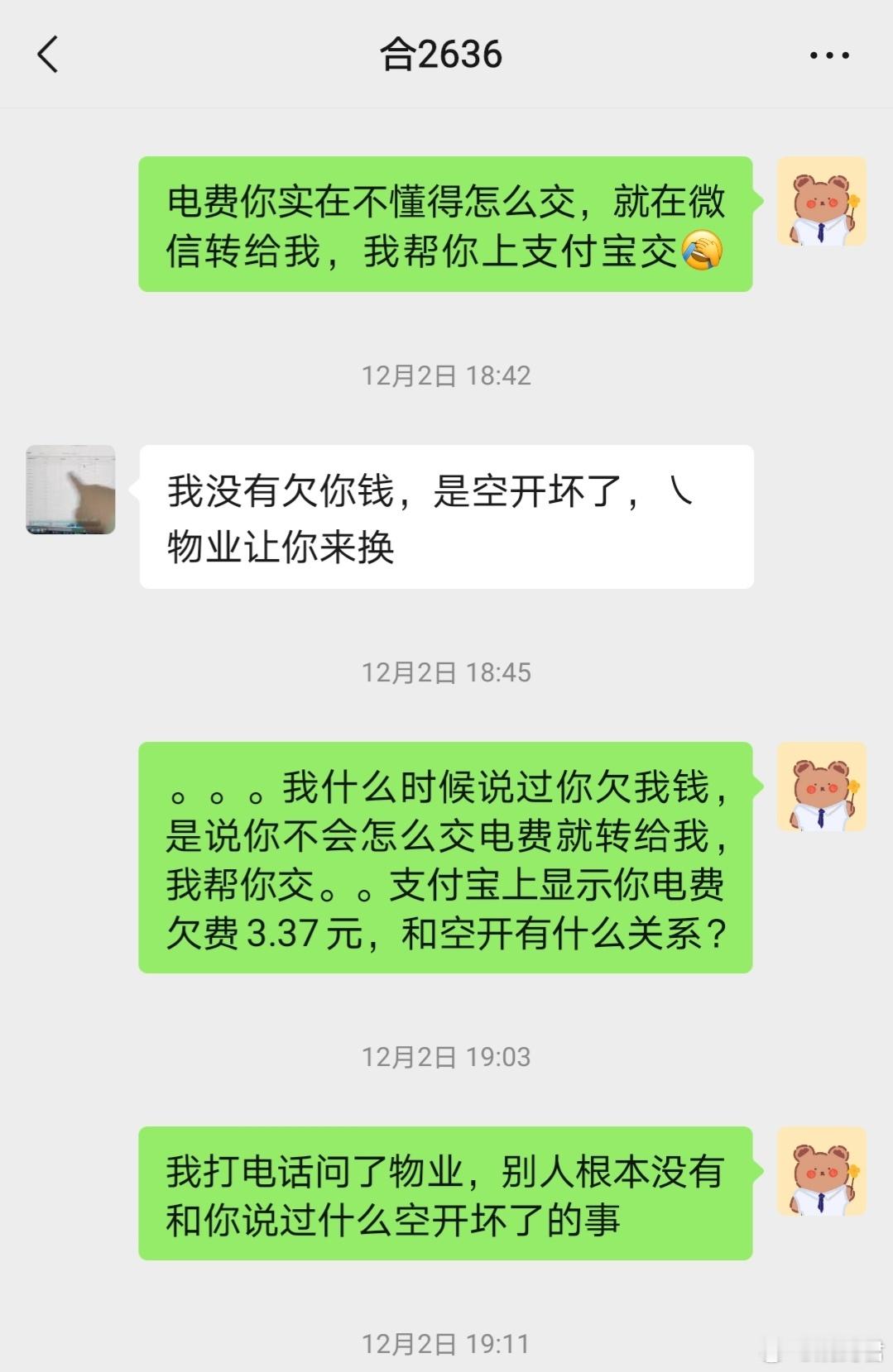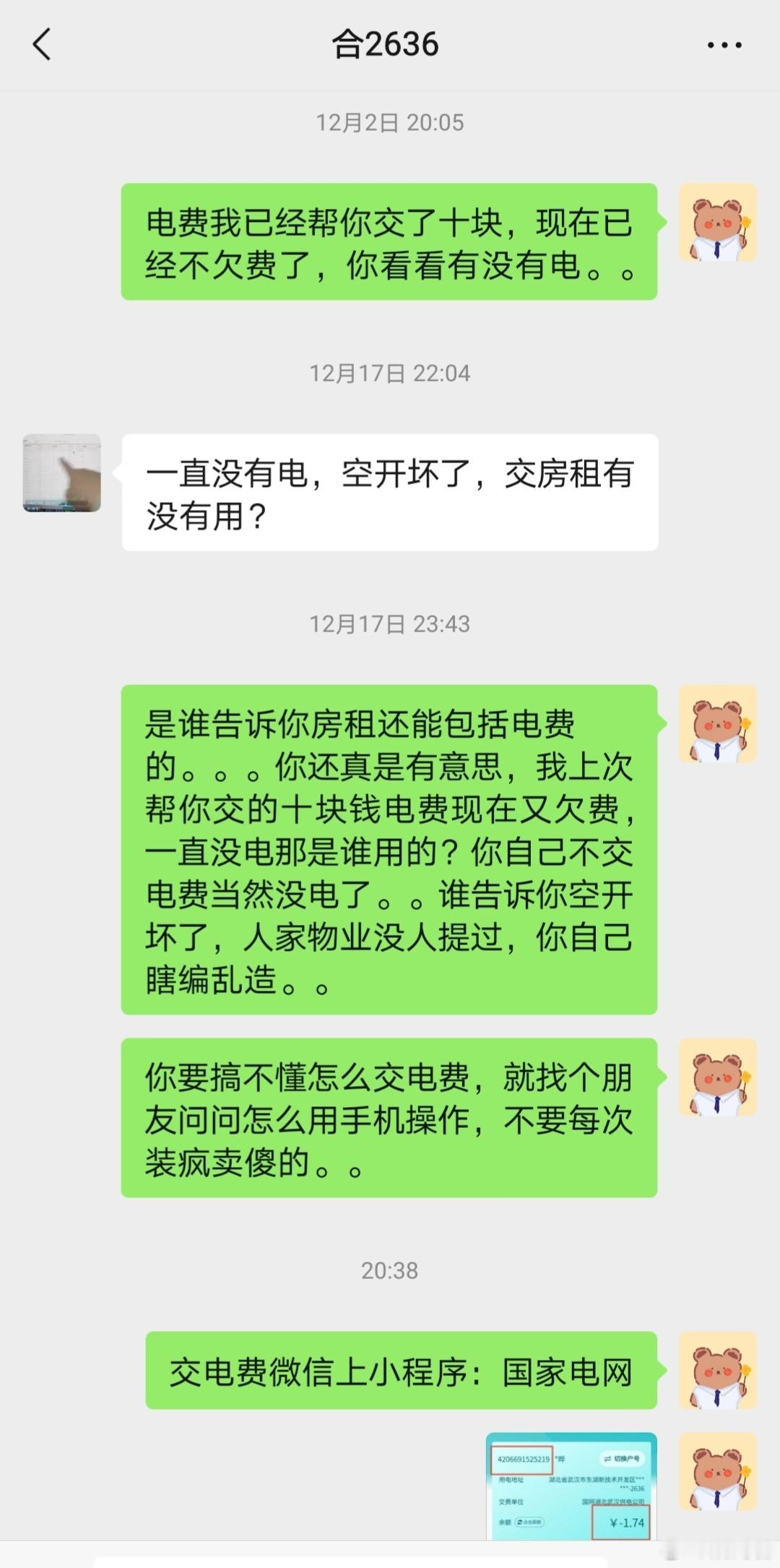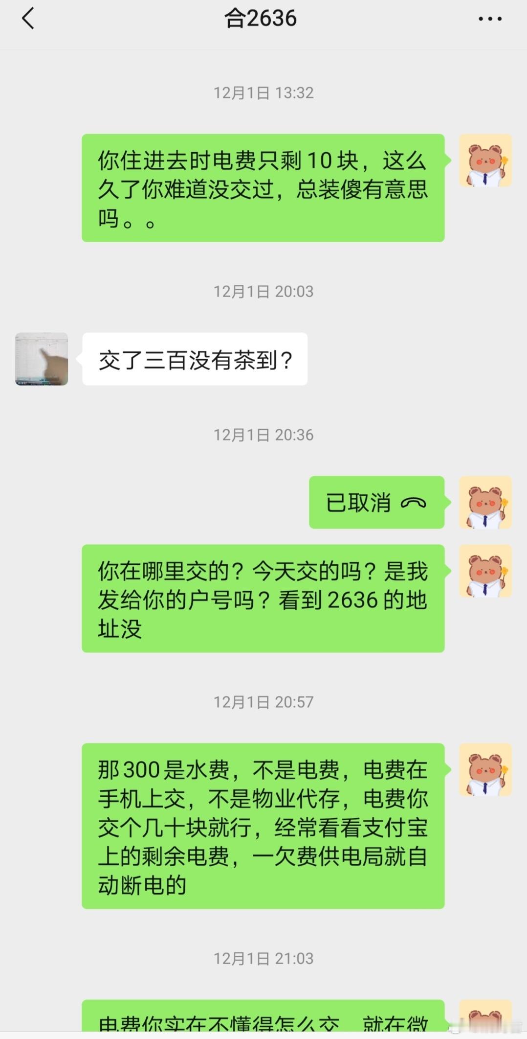 姚曳遇到一个奇葩租户,不到60岁一婆婆单独住,见面时说话看起来没什么问题,但逻辑思维感人,家里脏乱就不提了,欠水费要我去证明不关她事,最让人不解的是她四个月只用了不到三十岁电费,长期欠费被供电局断电,然后各种找我,一时拿水费当电费、一时撒谎物业说空开坏了、一时又变成房租含电费。。。最搞笑的是每次发来一条微信就永远不回消息,打电话通了永远不接,去房子里找她十次敲门九次不在。。。