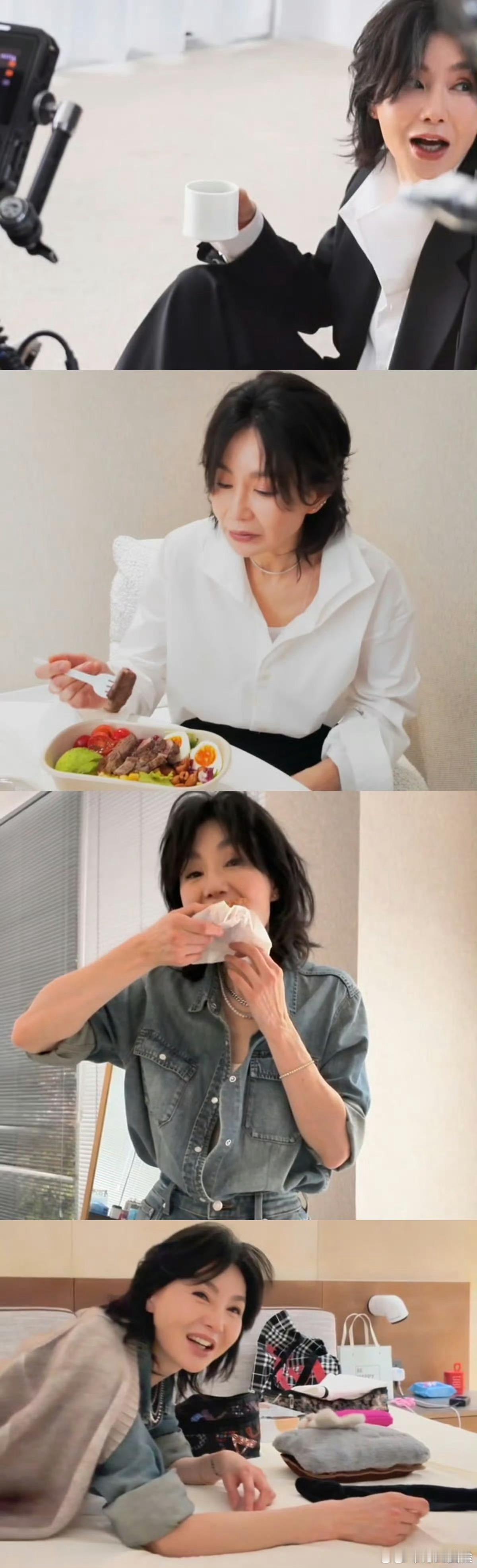 张曼玉影后松弛感 影后片场日常也太可爱了!卷头发啃披萨,拍空档嚼面包,保温杯里还藏着小甜水,随性大笑蹦跶,完全没有距离感~
