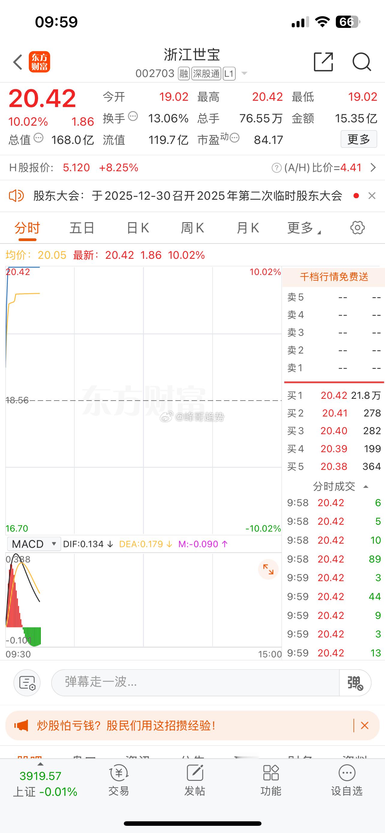 连续两天的早盘股浙江世宝你干到涨停板没有?恭喜介入的铁粉们收获涨停板,搞到的冒个